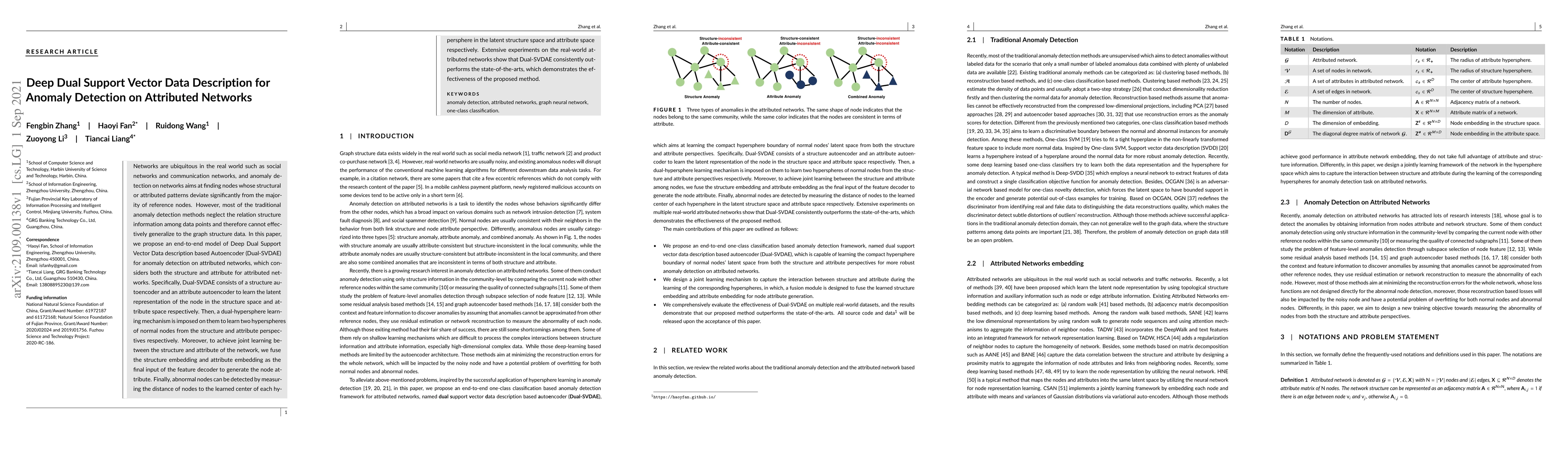 This paper proposes a Deep Dual Support Vector Data Description based Autoencoder (Dual-SVDAE) for anomaly detection in attributed networks, integrating both structural and attribute information. The model outperforms existing methods by effectively learning latent representations and detecting anomalies based on distances to learned hyperspheres.