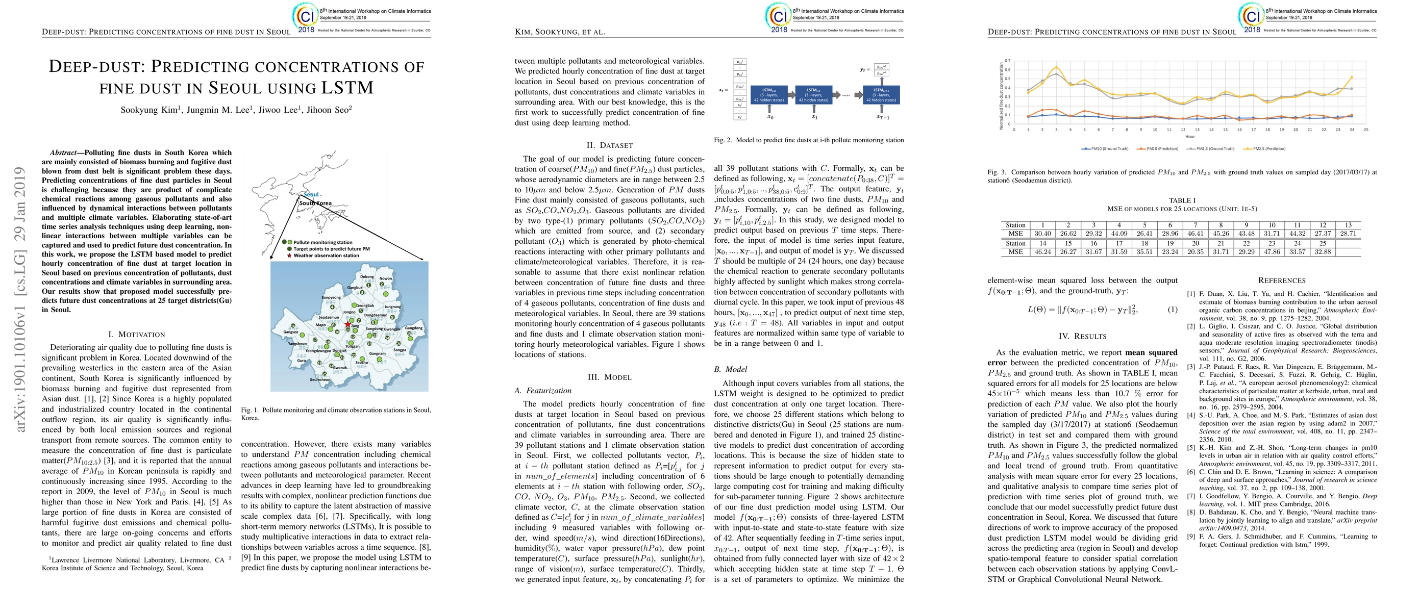 A deep learning model using LSTM predicts fine dust concentrations in Seoul with high accuracy, capturing complex chemical reactions and climate interactions. The model successfully forecasts dust levels at 25 target districts.