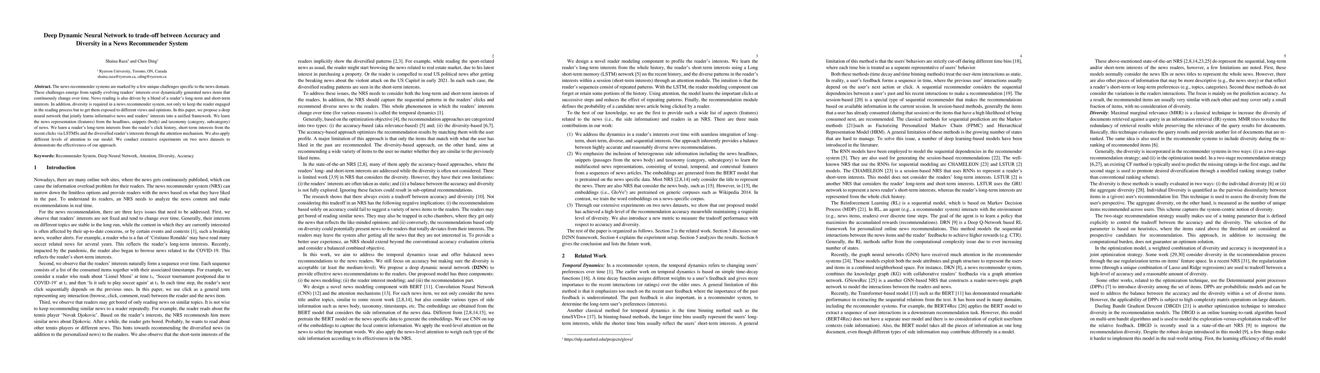 This paper proposes a deep dynamic neural network for a news recommender system that balances accuracy and diversity by jointly learning news features and readers' interests. The model uses LSTMs and attention mechanisms to capture both long-term and short-term interests, and experiments show its effectiveness on two news datasets.