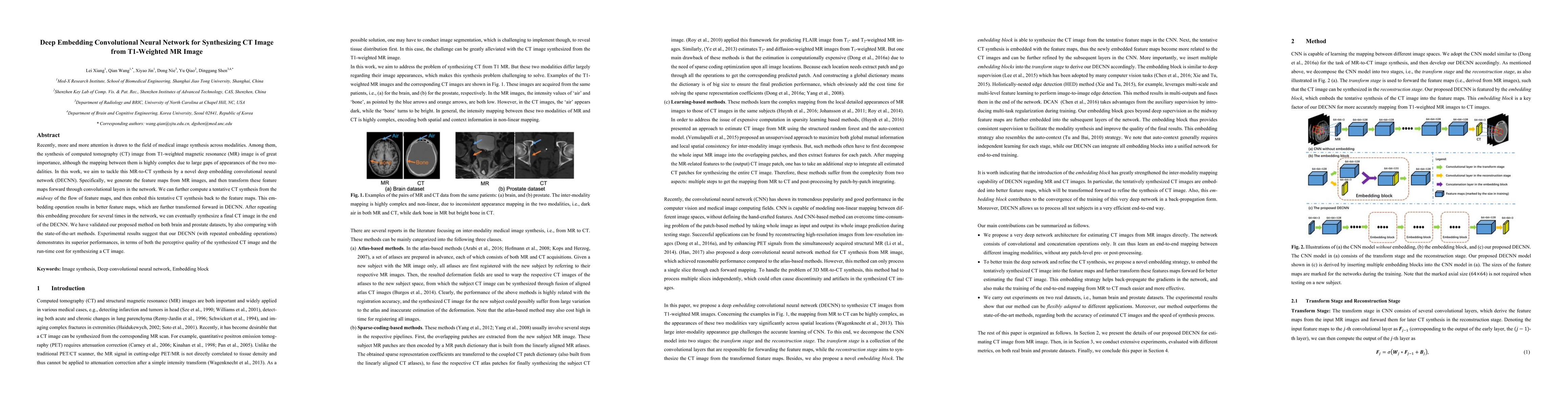 This paper proposes a Deep Embedding Convolutional Neural Network (DECNN) to synthesize CT images from T1-weighted MR images, addressing the complex modality gap. The DECNN iteratively embeds a tentative CT synthesis back into feature maps, improving the final synthesized CT image, which outperforms state-of-the-art methods in both quality and efficiency.