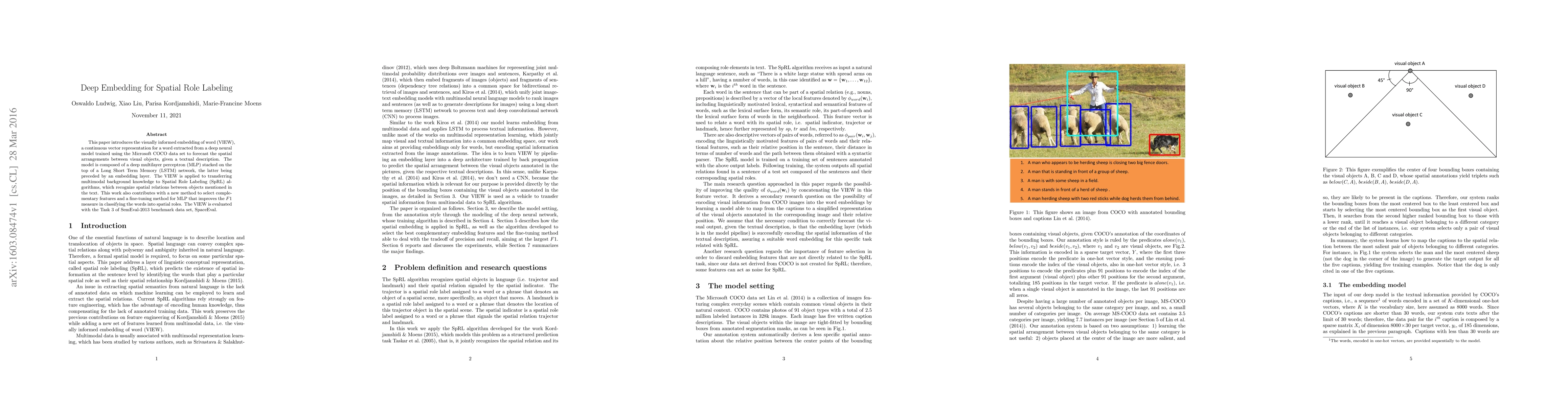 This paper presents VIEW, a deep learning model that generates continuous vector representations for words using Microsoft COCO dataset, aiming to predict spatial object arrangements from text. VIEW, combining LSTM and MLP, improves Spatial Role Labeling (SpRL) algorithms by integrating visual knowledge. It also introduces a method for selecting complementary features and fine-tuning MLP, enhancing the $F1$ measure for classifying words into spatial roles. The model's performance is validated on SemEval-2013 SpaceEval benchmark dataset.