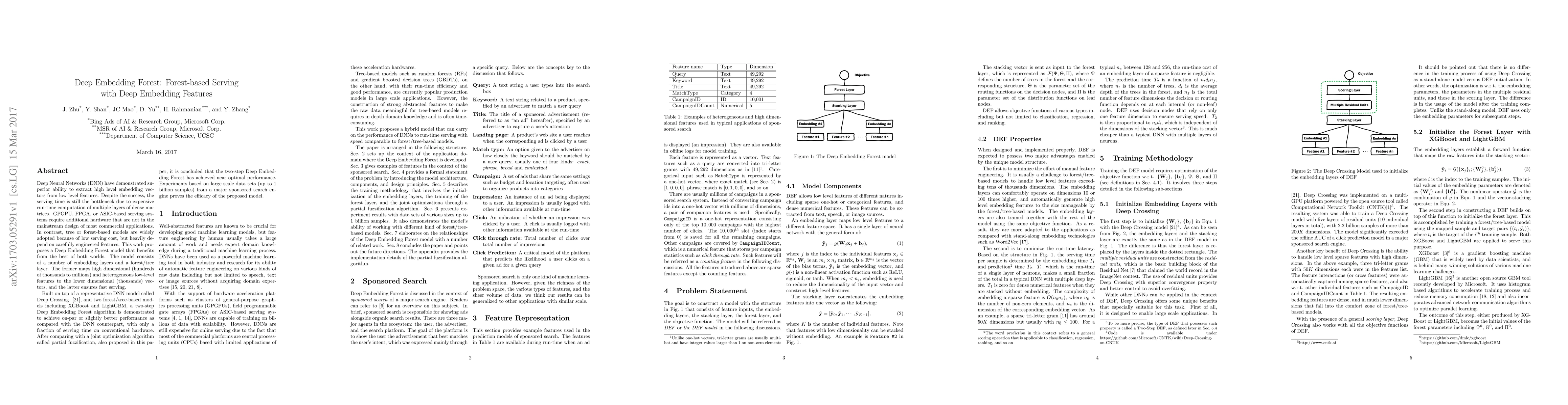 The Deep Embedding Forest model combines the feature extraction prowess of Deep Neural Networks with the low serving cost of tree-based models, achieving competitive performance with significantly reduced serving time on conventional hardware. Experiments on large datasets demonstrate its efficacy, showing near-optimal performance compared to joint optimization methods.