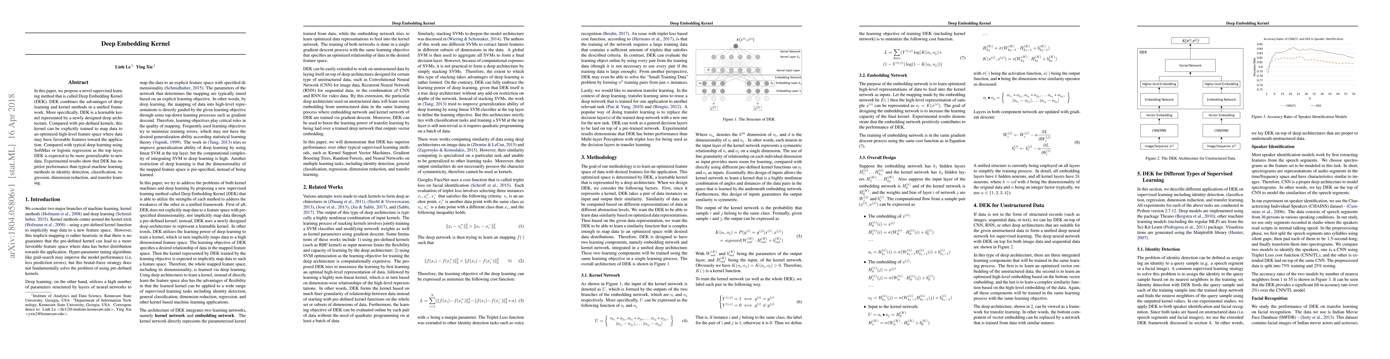 The Deep Embedding Kernel (DEK) method integrates deep learning and kernel techniques, offering a learnable kernel that optimizes feature mapping for improved performance in various tasks. DEK outperforms traditional machine learning methods in identity detection, classification, regression, dimension reduction, and transfer learning.