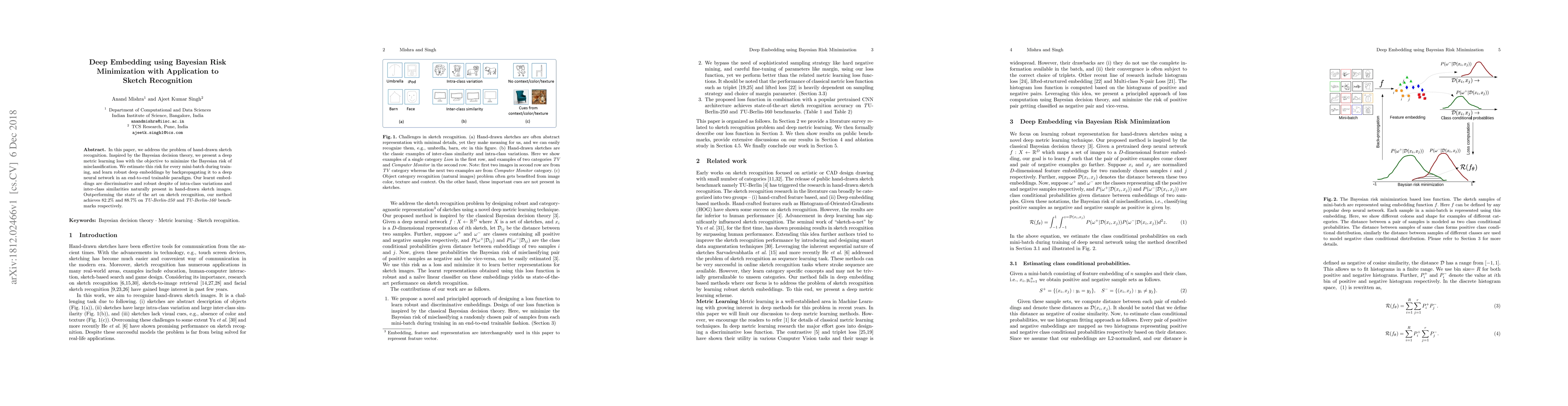 In this paper, we address the problem of hand-drawn sketch recognition. Inspired by the Bayesian decision theory, we present a deep metric learning loss with the objective to minimize the Bayesian risk of misclassification. We estimate this risk for every mini-batch during training, and learn robust deep embeddings by backpropagating it to a deep neural network in an end-to-end trainable paradigm. Our learnt embeddings are discriminative and robust despite of intra-class variations and inter-class similarities naturally present in hand-drawn sketch images. Outperforming the state of the art on sketch recognition, our method achieves 82.2% and 88.7% on TU-Berlin-250 and TU-Berlin-160 benchmarks respectively.