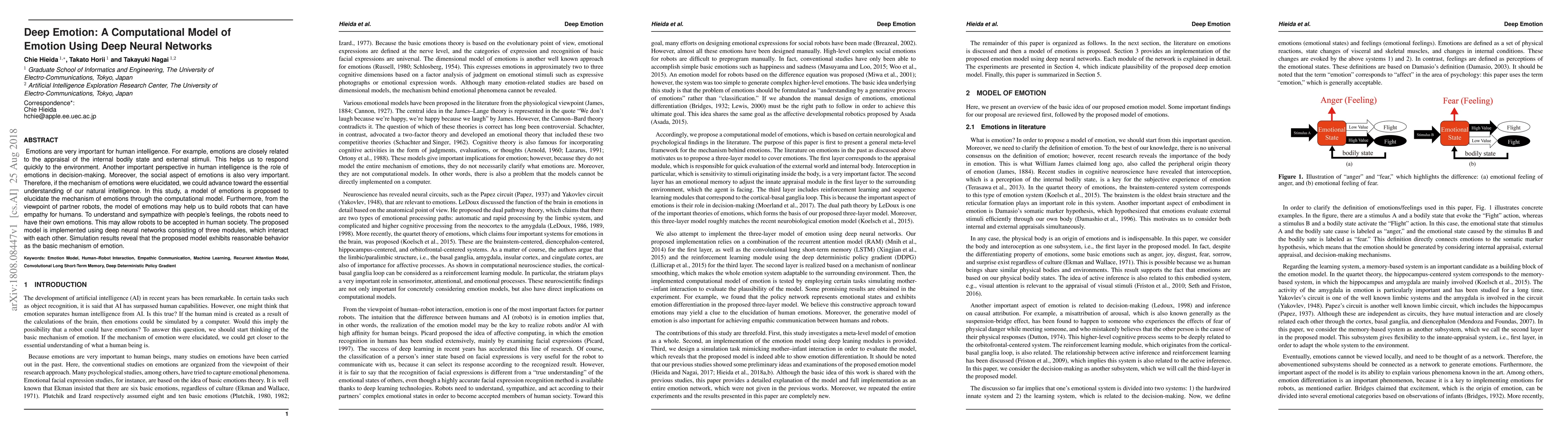 The paper introduces a deep neural network-based computational model of emotions with three interacting modules: RAM, decision-making, and a second layer for improved performance.