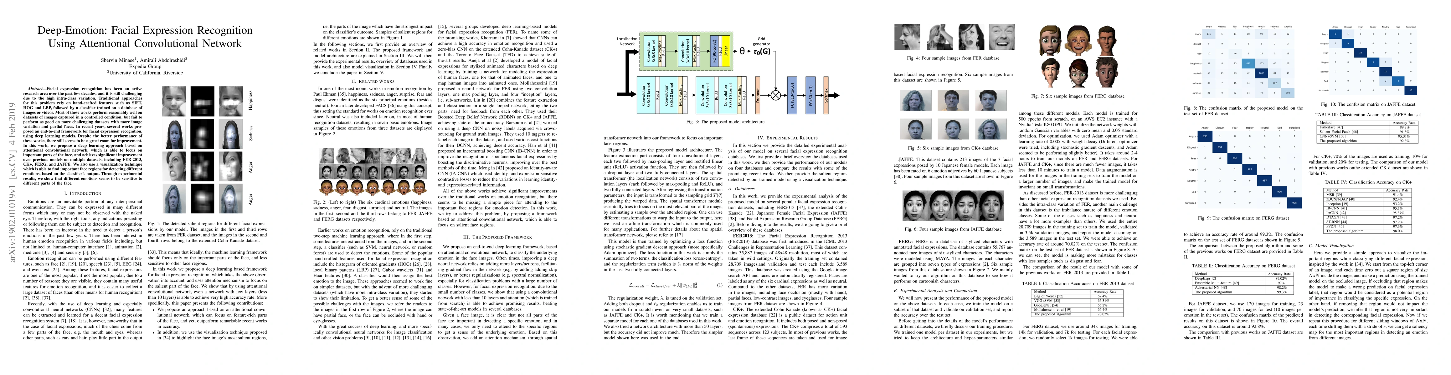 Facial expression recognition has been an active research area over the past few decades, and it is still challenging due to the high intra-class variation. Traditional approaches for this problem rely on hand-crafted features such as SIFT, HOG and LBP, followed by a classifier trained on a database of images or videos. Most of these works perform reasonably well on datasets of images captured in a controlled condition, but fail to perform as good on more challenging datasets with more image variation and partial faces. In recent years, several works proposed an end-to-end framework for facial expression recognition, using deep learning models. Despite the better performance of these works, there still seems to be a great room for improvement. In this work, we propose a deep learning approach based on attentional convolutional network, which is able to focus on important parts of the face, and achieves significant improvement over previous models on multiple datasets, including FER-2013, CK+, FERG, and JAFFE. We also use a visualization technique which is able to find important face regions for detecting different emotions, based on the classifier's output. Through experimental results, we show that different emotions seems to be sensitive to different parts of the face.