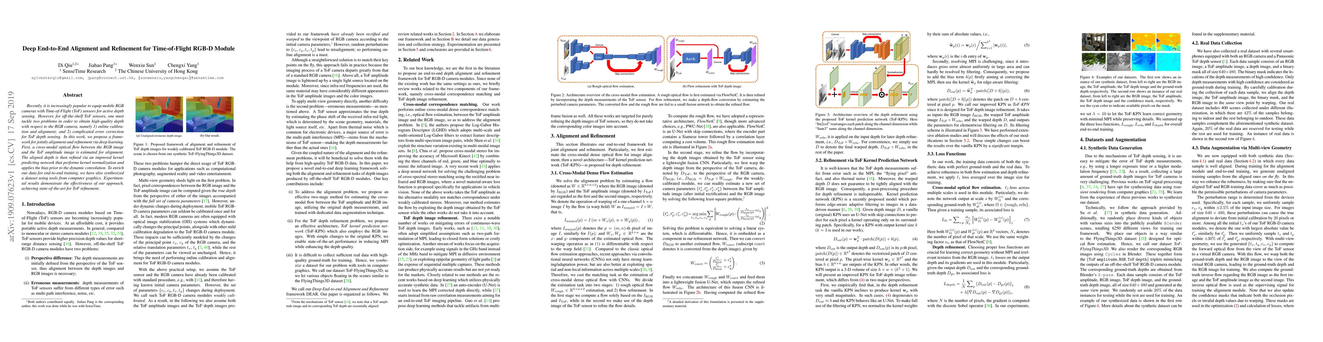 This paper proposes a deep learning framework for aligning and refining depth maps from Time-of-Flight (ToF) sensors with RGB images, addressing online calibration and error correction. It uses cross-modal optical flow for alignment and an improved kernel predicting network for refinement, achieving state-of-the-art results in ToF depth refinement.