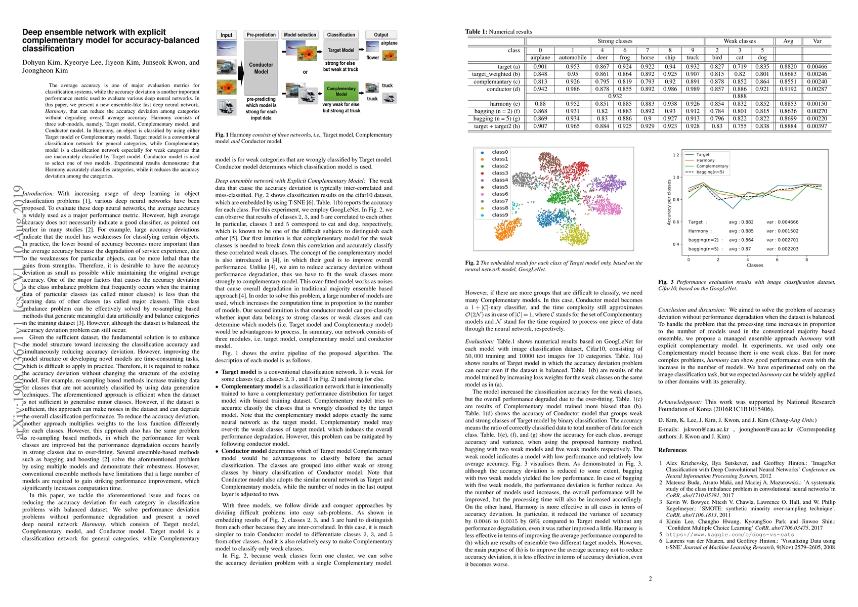 The average accuracy is one of major evaluation metrics for classification systems, while the accuracy deviation is another important performance metric used to evaluate various deep neural networks. In this paper, we present a new ensemble-like fast deep neural network, Harmony, that can reduce the accuracy deviation among categories without degrading overall average accuracy. Harmony consists of three sub-models, namely, Target model, Complementary model, and Conductor model. In Harmony, an object is classified by using either Target model or Complementary model. Target model is a conventional classification network for general categories, while Complementary model is a classification network especially for weak categories that are inaccurately classified by Target model. Conductor model is used to select one of two models. Experimental results demonstrate that Harmony accurately classifies categories, while it reduces the accuracy deviation among the categories.