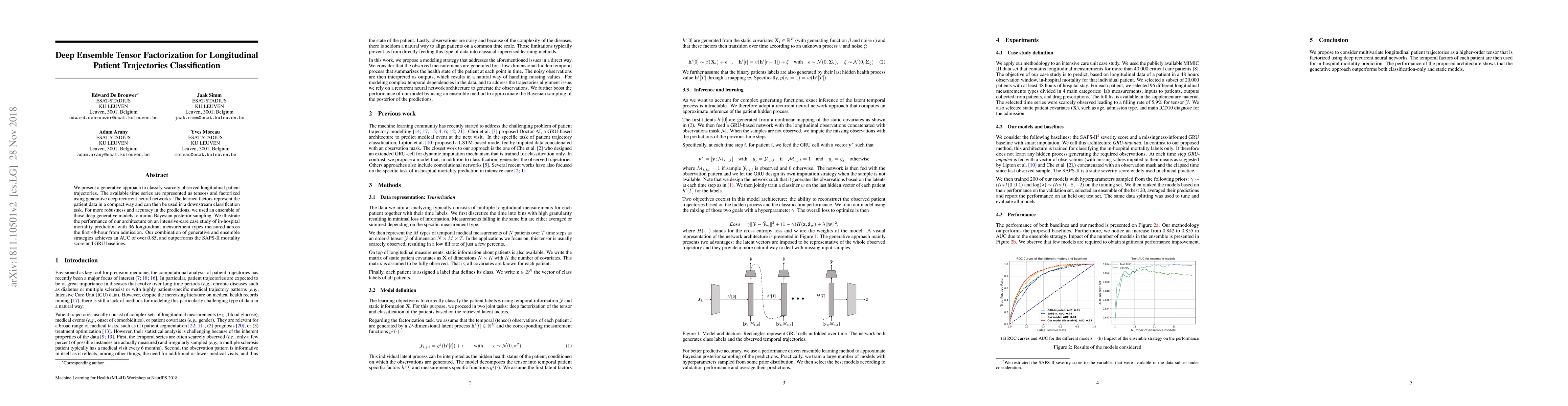 We present a generative approach to classify scarcely observed longitudinal patient trajectories. The available time series are represented as tensors and factorized using generative deep recurrent neural networks. The learned factors represent the patient data in a compact way and can then be used in a downstream classification task. For more robustness and accuracy in the predictions, we used an ensemble of those deep generative models to mimic Bayesian posterior sampling. We illustrate the performance of our architecture on an intensive-care case study of in-hospital mortality prediction with 96 longitudinal measurement types measured across the first 48-hour from admission. Our combination of generative and ensemble strategies achieves an AUC of over 0.85, and outperforms the SAPS-II mortality score and GRU baselines.