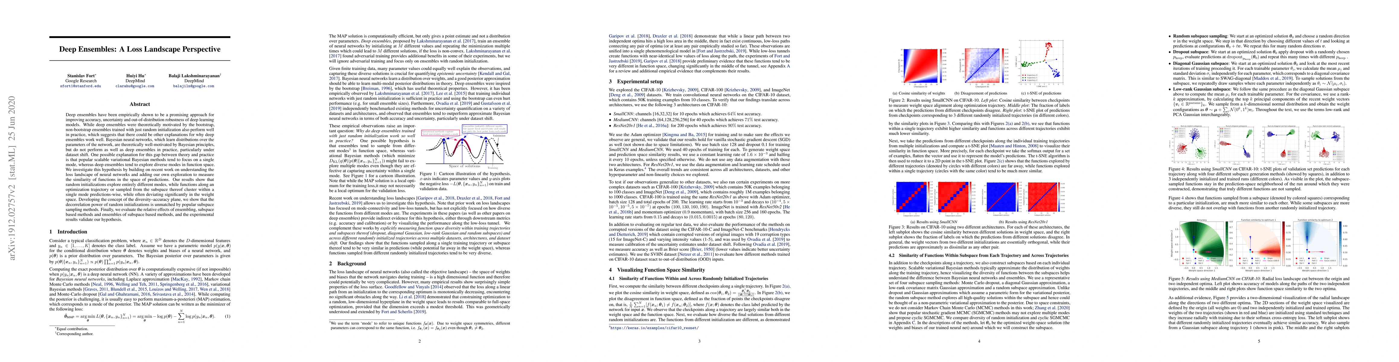 Deep ensembles have been empirically shown to be a promising approach for improving accuracy, uncertainty and out-of-distribution robustness of deep learning models. While deep ensembles were theoretically motivated by the bootstrap, non-bootstrap ensembles trained with just random initialization also perform well in practice, which suggests that there could be other explanations for why deep ensembles work well. Bayesian neural networks, which learn distributions over the parameters of the network, are theoretically well-motivated by Bayesian principles, but do not perform as well as deep ensembles in practice, particularly under dataset shift. One possible explanation for this gap between theory and practice is that popular scalable variational Bayesian methods tend to focus on a single mode, whereas deep ensembles tend to explore diverse modes in function space. We investigate this hypothesis by building on recent work on understanding the loss landscape of neural networks and adding our own exploration to measure the similarity of functions in the space of predictions. Our results show that random initializations explore entirely different modes, while functions along an optimization trajectory or sampled from the subspace thereof cluster within a single mode predictions-wise, while often deviating significantly in the weight space. Developing the concept of the diversity--accuracy plane, we show that the decorrelation power of random initializations is unmatched by popular subspace sampling methods. Finally, we evaluate the relative effects of ensembling, subspace based methods and ensembles of subspace based methods, and the experimental results validate our hypothesis.