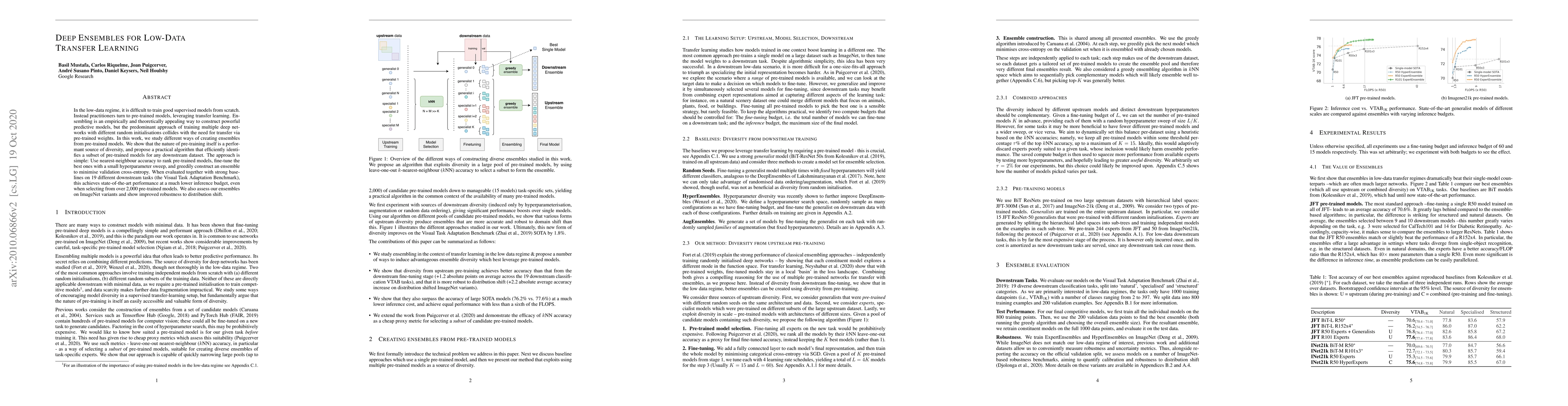 In the low-data regime, it is difficult to train good supervised models from scratch. Instead practitioners turn to pre-trained models, leveraging transfer learning. Ensembling is an empirically and theoretically appealing way to construct powerful predictive models, but the predominant approach of training multiple deep networks with different random initialisations collides with the need for transfer via pre-trained weights. In this work, we study different ways of creating ensembles from pre-trained models. We show that the nature of pre-training itself is a performant source of diversity, and propose a practical algorithm that efficiently identifies a subset of pre-trained models for any downstream dataset. The approach is simple: Use nearest-neighbour accuracy to rank pre-trained models, fine-tune the best ones with a small hyperparameter sweep, and greedily construct an ensemble to minimise validation cross-entropy. When evaluated together with strong baselines on 19 different downstream tasks (the Visual Task Adaptation Benchmark), this achieves state-of-the-art performance at a much lower inference budget, even when selecting from over 2,000 pre-trained models. We also assess our ensembles on ImageNet variants and show improved robustness to distribution shift.