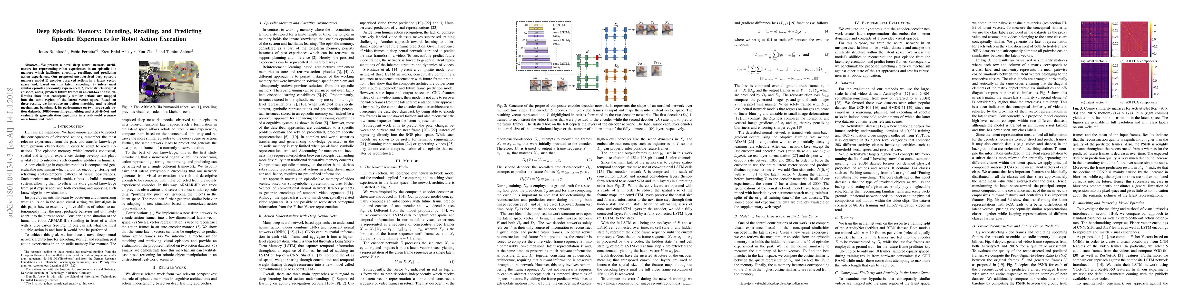 This paper introduces a deep neural network architecture for an unsupervised deep episodic memory model that encodes, recalls, and predicts robot action experiences. The model maps similar actions into the same latent space, enabling effective action matching and retrieval, which is benchmarked on large-scale datasets and tested on a humanoid robot.