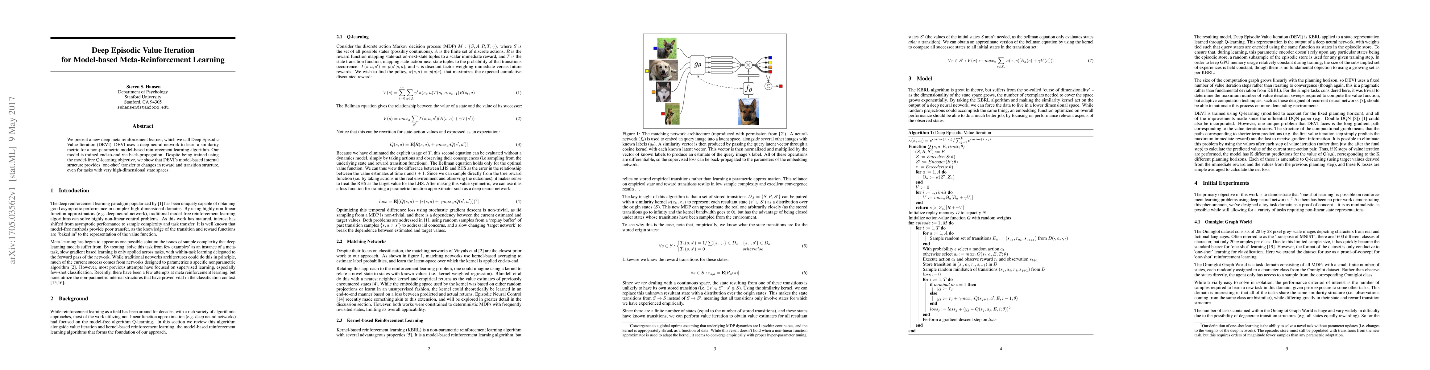 Summary: Deep Episodic Value Iteration (DEVI) is a novel deep meta reinforcement learning approach that employs a neural network to learn a similarity metric for model-based reinforcement learning. Despite being trained with a model-free objective, DEVI demonstrates effective "one-shot" transfer to new reward and transition structures, even in high-dimensional state spaces.
