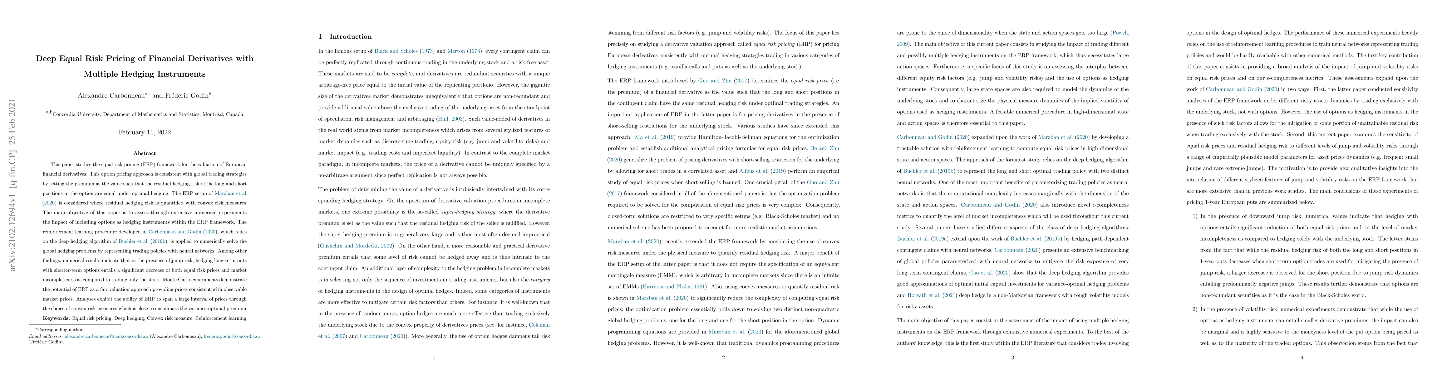 This paper studies the equal risk pricing (ERP) framework for the valuation of European financial derivatives. This option pricing approach is consistent with global trading strategies by setting the premium as the value such that the residual hedging risk of the long and short positions in the option are equal under optimal hedging. The ERP setup of Marzban et al. (2020) is considered where residual hedging risk is quantified with convex risk measures. The main objective of this paper is to assess through extensive numerical experiments the impact of including options as hedging instruments within the ERP framework. The reinforcement learning procedure developed in Carbonneau and Godin (2020), which relies on the deep hedging algorithm of Buehler et al. (2019b), is applied to numerically solve the global hedging problems by representing trading policies with neural networks. Among other findings, numerical results indicate that in the presence of jump risk, hedging long-term puts with shorter-term options entails a significant decrease of both equal risk prices and market incompleteness as compared to trading only the stock. Monte Carlo experiments demonstrate the potential of ERP as a fair valuation approach providing prices consistent with observable market prices. Analyses exhibit the ability of ERP to span a large interval of prices through the choice of convex risk measures which is close to encompass the variance-optimal premium.