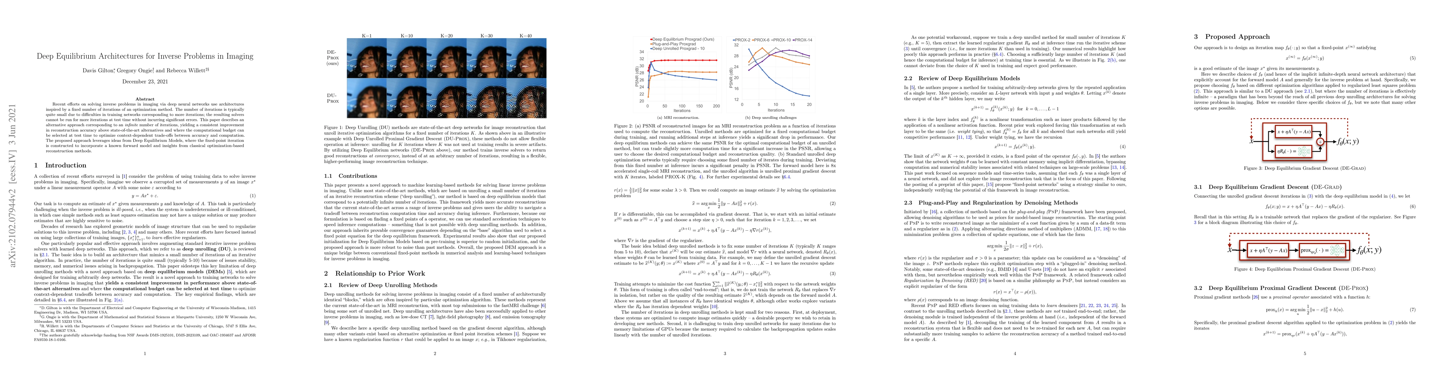 This paper proposes Deep Equilibrium Architectures to solve inverse problems in imaging, offering a consistent improvement over existing methods by leveraging an infinite number of iterations, thus allowing flexible computational budgets at test time for optimized trade-offs between accuracy and computation. The approach combines Deep Equilibrium Models with classical optimization techniques for enhanced reconstruction accuracy.