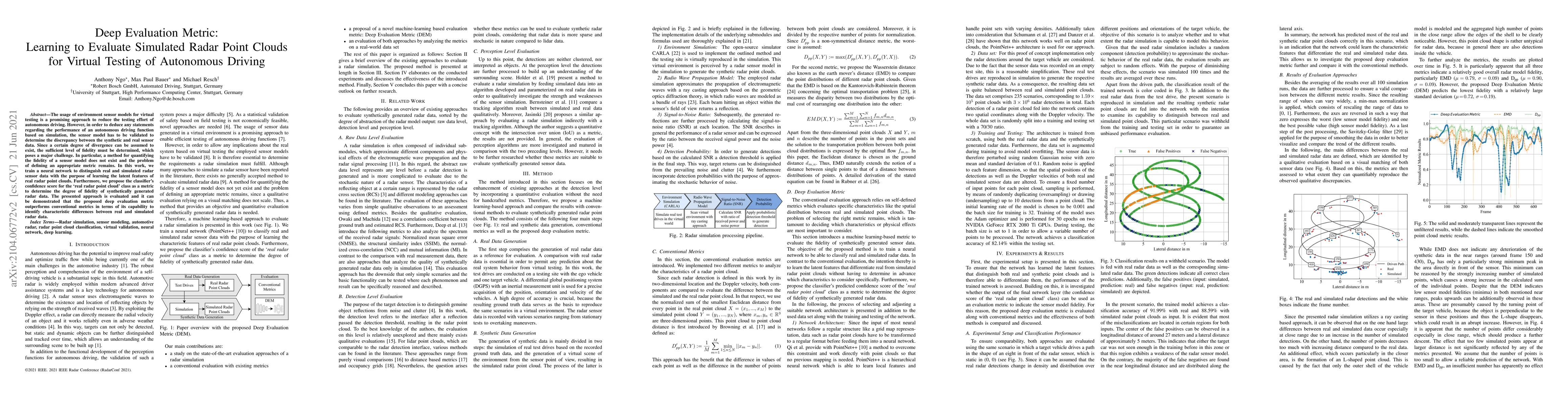 The usage of environment sensor models for virtual testing is a promising approach to reduce the testing effort of autonomous driving. However, in order to deduce any statements regarding the performance of an autonomous driving function based on simulation, the sensor model has to be validated to determine the discrepancy between the synthetic and real sensor data. Since a certain degree of divergence can be assumed to exist, the sufficient level of fidelity must be determined, which poses a major challenge. In particular, a method for quantifying the fidelity of a sensor model does not exist and the problem of defining an appropriate metric remains. In this work, we train a neural network to distinguish real and simulated radar sensor data with the purpose of learning the latent features of real radar point clouds. Furthermore, we propose the classifier's confidence score for the `real radar point cloud' class as a metric to determine the degree of fidelity of synthetically generated radar data. The presented approach is evaluated and it can be demonstrated that the proposed deep evaluation metric outperforms conventional metrics in terms of its capability to identify characteristic differences between real and simulated radar data.