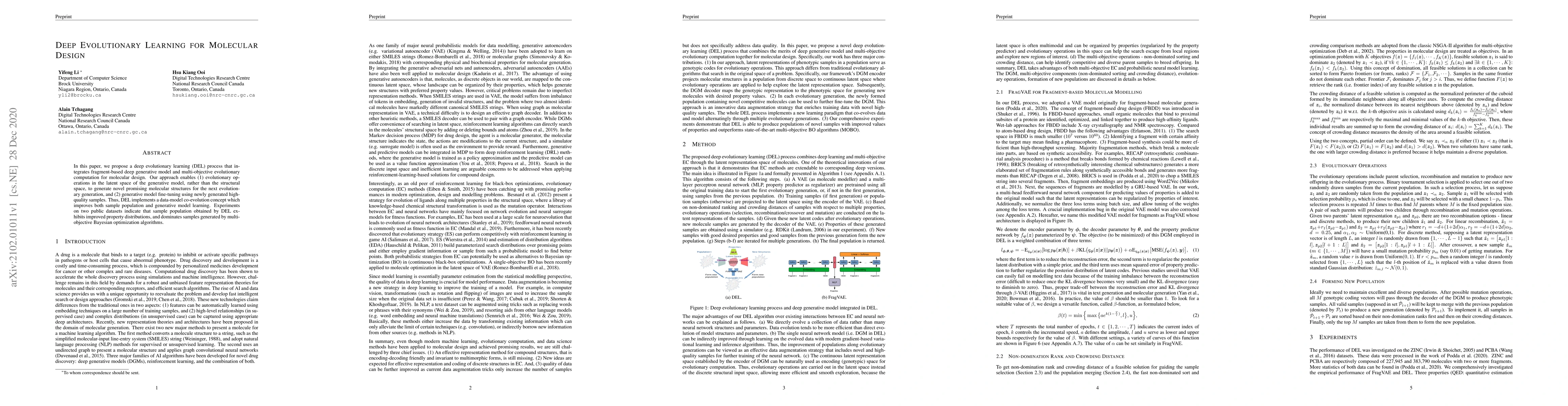 This paper introduces deep evolutionary learning (DEL) for molecular design, combining a fragment-based deep generative model with multi-objective evolutionary computation. DEL enhances both the generative model and the sample population through data-model co-evolution, leading to improved property distributions and outperforming multi-objective Bayesian optimization algorithms.