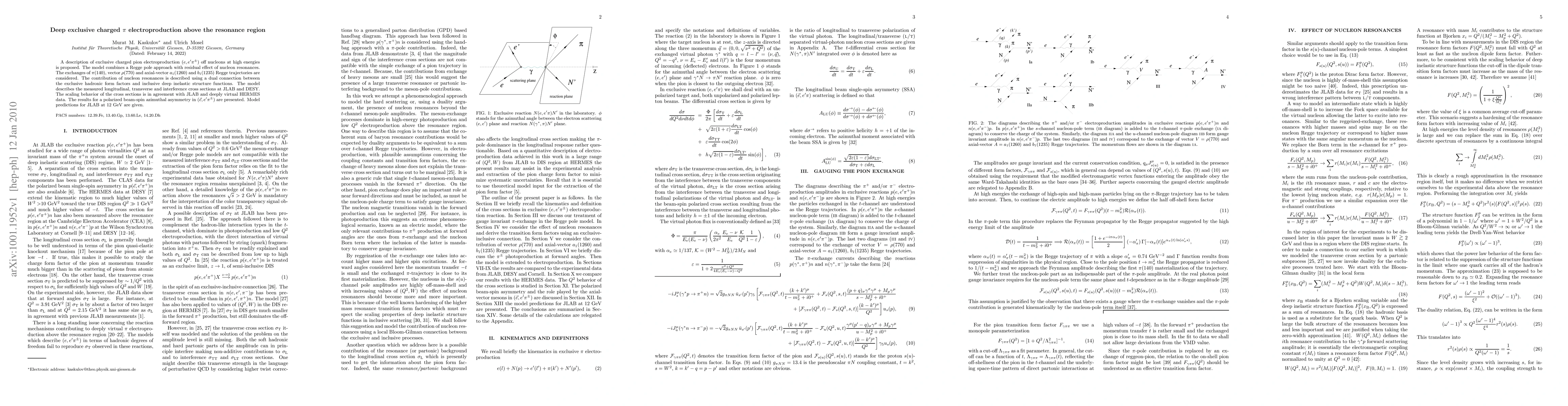 This paper proposes a model for high-energy exclusive charged pion electroproduction off nucleons, combining Regge pole and nucleon resonance effects. The model accurately predicts measured cross sections and scaling behavior, and provides predictions for beam-spin azimuthal asymmetries at JLAB.