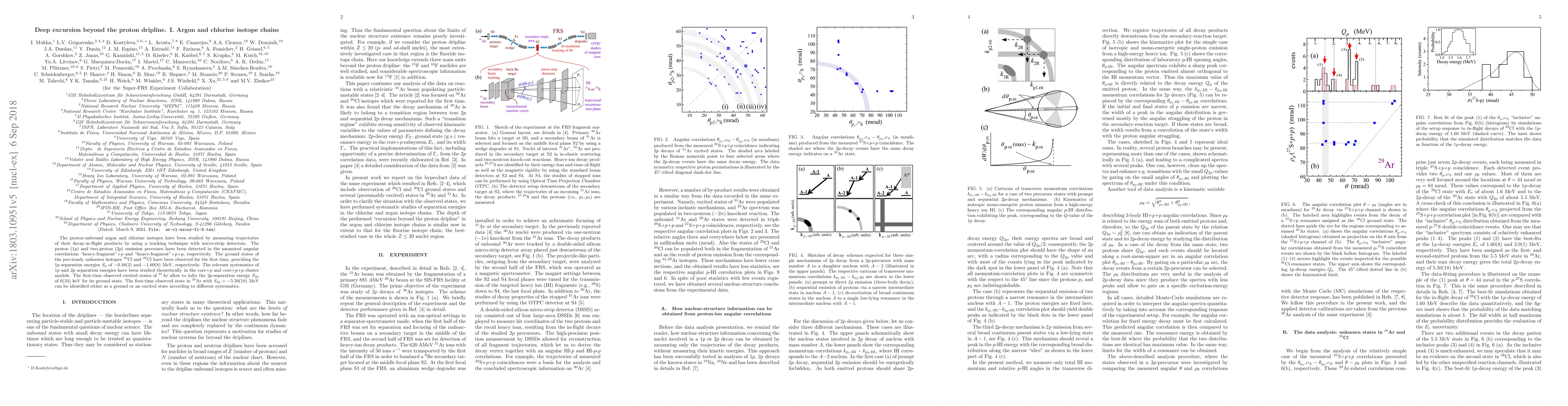The proton-unbound argon and chlorine isotopes have been studied by measuring trajectories of their decay-in-flight products by using a tracking technique with micro-strip detectors. The proton ($1p$) and two-proton ($2p$) emission processes have been detected in the measured angular correlations "heavy-fragment"+$p$ and "heavy-fragment"+$p$+$p$, respectively. The ground states of the previously unknown isotopes $^{30}$Cl and $^{28}$Cl have been observed for the first time, providing the $1p$-separation energies $S_p$ of $-0.48(2)$ and $-1.60(8)$ MeV, respectively. The relevant systematics of $1p$ and $2p$ separations energies have been studied theoretically in the core+$p$ and core+$p$+$p$ cluster models. The first-time observed excited states of $^{31}$Ar allow to infer the $2p$-separation energy $S_{2p}$ of 6(34) keV for its ground state. The first-time observed state in $^{29}$Ar with $S_{2p} = -5.50(18)$ MeV can be identified either as a ground or an excited state according to different systematics.