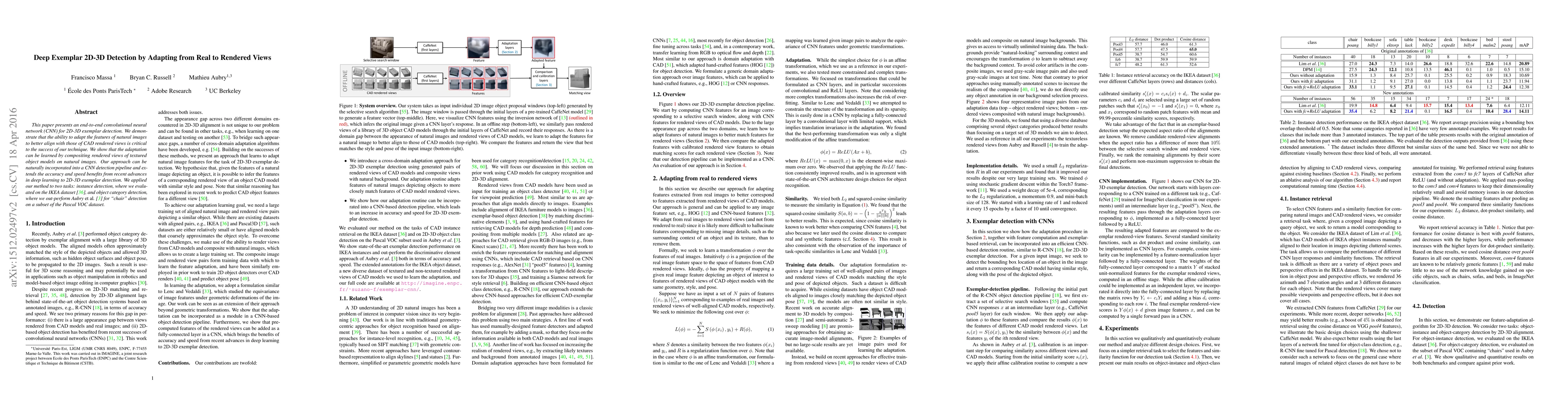This research paper introduces an end-to-end CNN for 2D-3D exemplar detection, emphasizing the importance of adapting natural image features to align with CAD rendered views. The method involves learning this adaptation through compositing rendered views onto natural images, enhancing the CNN detection pipeline for improved accuracy and speed. The technique was tested on instance detection in the IKEA dataset and outperformed existing methods for "chair" detection in a subset of the Pascal VOC dataset.