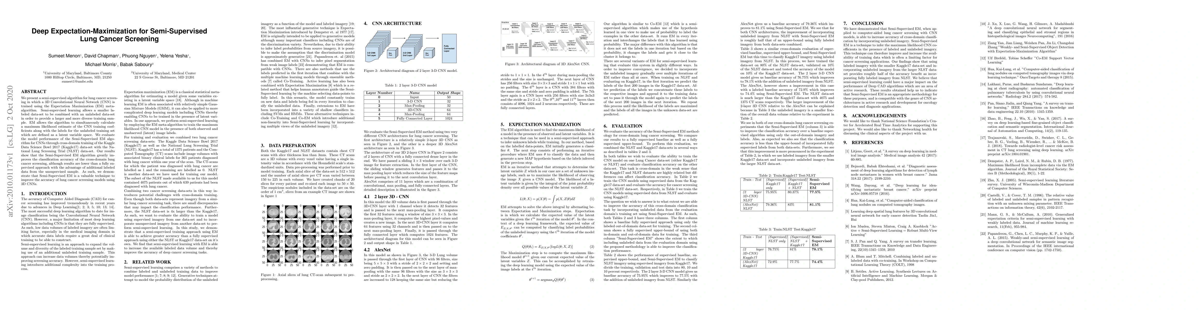 This paper introduces a semi-supervised algorithm combining 3D CNNs and Expectation-Maximization for lung cancer screening, showing improved classification accuracy through cross-domain training despite lower results compared to fully supervised methods. The technique leverages unlabeled data to enhance model performance.