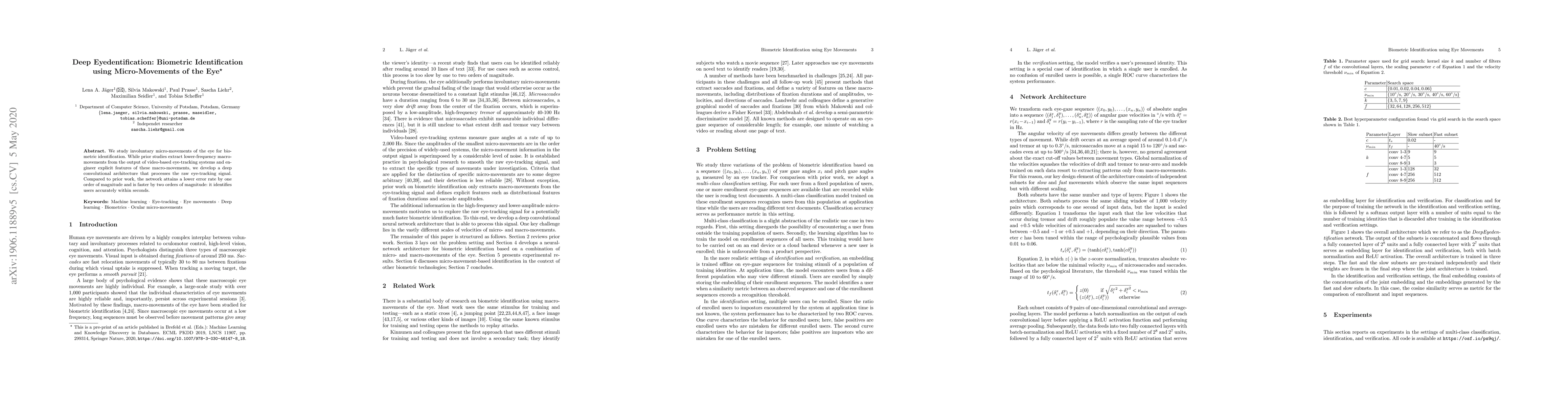 We study involuntary micro-movements of the eye for biometric identification. While prior studies extract lower-frequency macro-movements from the output of video-based eye-tracking systems and engineer explicit features of these macro-movements, we develop a deep convolutional architecture that processes the raw eye-tracking signal. Compared to prior work, the network attains a lower error rate by one order of magnitude and is faster by two orders of magnitude: it identifies users accurately within seconds.