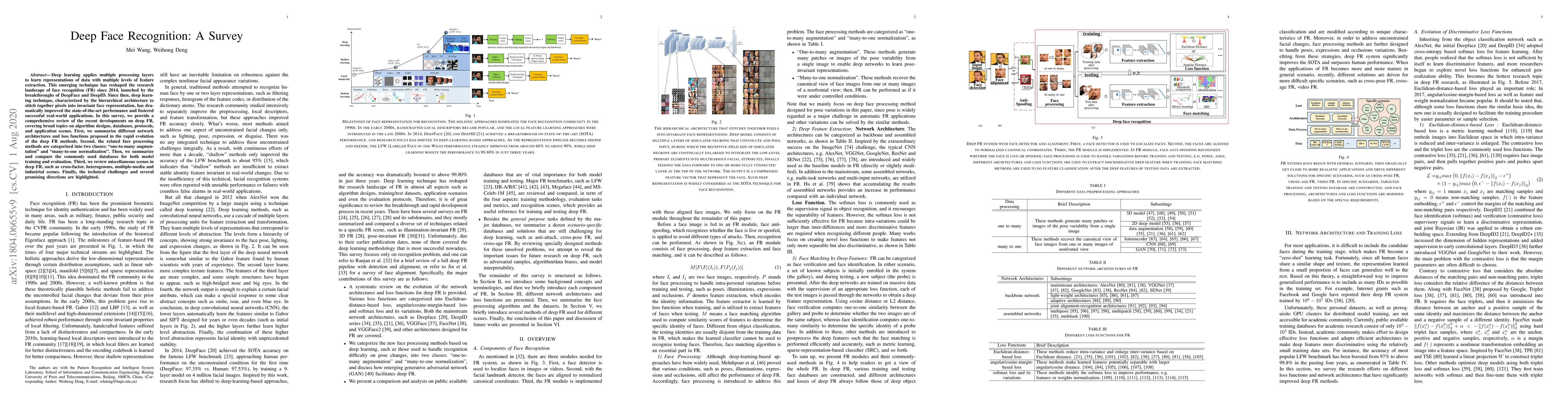 Deep learning applies multiple processing layers to learn representations of data with multiple levels of feature extraction. This emerging technique has reshaped the research landscape of face recognition (FR) since 2014, launched by the breakthroughs of DeepFace and DeepID. Since then, deep learning technique, characterized by the hierarchical architecture to stitch together pixels into invariant face representation, has dramatically improved the state-of-the-art performance and fostered successful real-world applications. In this survey, we provide a comprehensive review of the recent developments on deep FR, covering broad topics on algorithm designs, databases, protocols, and application scenes. First, we summarize different network architectures and loss functions proposed in the rapid evolution of the deep FR methods. Second, the related face processing methods are categorized into two classes: "one-to-many augmentation" and "many-to-one normalization". Then, we summarize and compare the commonly used databases for both model training and evaluation. Third, we review miscellaneous scenes in deep FR, such as cross-factor, heterogenous, multiple-media and industrial scenes. Finally, the technical challenges and several promising directions are highlighted.
