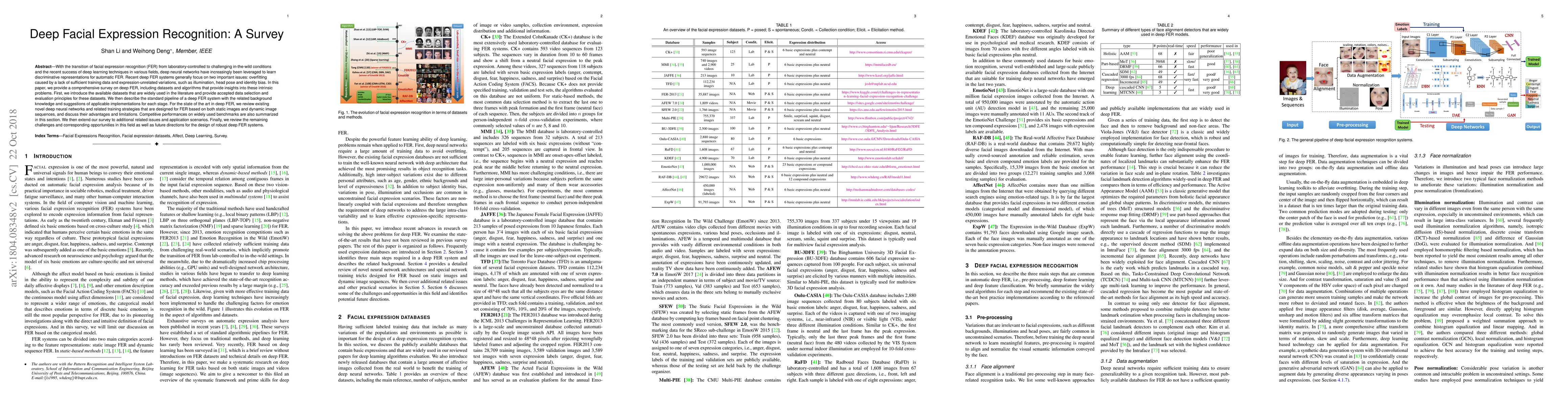 With the transition of facial expression recognition (FER) from laboratory-controlled to challenging in-the-wild conditions and the recent success of deep learning techniques in various fields, deep neural networks have increasingly been leveraged to learn discriminative representations for automatic FER. Recent deep FER systems generally focus on two important issues: overfitting caused by a lack of sufficient training data and expression-unrelated variations, such as illumination, head pose and identity bias. In this paper, we provide a comprehensive survey on deep FER, including datasets and algorithms that provide insights into these intrinsic problems. First, we describe the standard pipeline of a deep FER system with the related background knowledge and suggestions of applicable implementations for each stage. We then introduce the available datasets that are widely used in the literature and provide accepted data selection and evaluation principles for these datasets. For the state of the art in deep FER, we review existing novel deep neural networks and related training strategies that are designed for FER based on both static images and dynamic image sequences, and discuss their advantages and limitations. Competitive performances on widely used benchmarks are also summarized in this section. We then extend our survey to additional related issues and application scenarios. Finally, we review the remaining challenges and corresponding opportunities in this field as well as future directions for the design of robust deep FER systems.