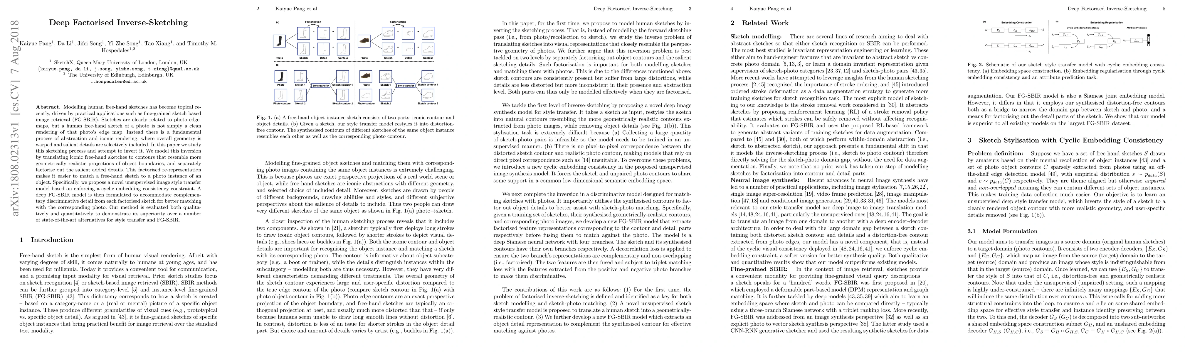 Modelling human free-hand sketches has become topical recently, driven by practical applications such as fine-grained sketch based image retrieval (FG-SBIR). Sketches are clearly related to photo edge-maps, but a human free-hand sketch of a photo is not simply a clean rendering of that photo's edge map. Instead there is a fundamental process of abstraction and iconic rendering, where overall geometry is warped and salient details are selectively included. In this paper we study this sketching process and attempt to invert it. We model this inversion by translating iconic free-hand sketches to contours that resemble more geometrically realistic projections of object boundaries, and separately factorise out the salient added details. This factorised re-representation makes it easier to match a free-hand sketch to a photo instance of an object. Specifically, we propose a novel unsupervised image style transfer model based on enforcing a cyclic embedding consistency constraint. A deep FG-SBIR model is then formulated to accommodate complementary discriminative detail from each factorised sketch for better matching with the corresponding photo. Our method is evaluated both qualitatively and quantitatively to demonstrate its superiority over a number of state-of-the-art alternatives for style transfer and FG-SBIR.