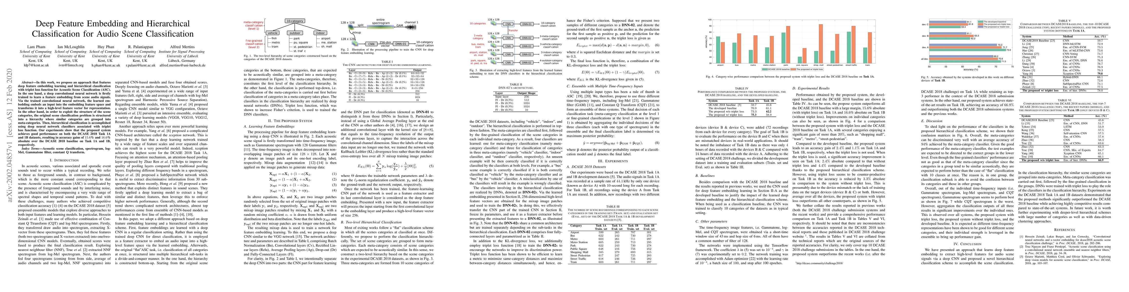 In this work, we propose an approach that features deep feature embedding learning and hierarchical classification with triplet loss function for Acoustic Scene Classification (ASC). In the one hand, a deep convolutional neural network is firstly trained to learn a feature embedding from scene audio signals. Via the trained convolutional neural network, the learned embedding embeds an input into the embedding feature space and transforms it into a high-level feature vector for representation. In the other hand, in order to exploit the structure of the scene categories, the original scene classification problem is structured into a hierarchy where similar categories are grouped into meta-categories. Then, hierarchical classification is accomplished using deep neural network classifiers associated with triplet loss function. Our experiments show that the proposed system achieves good performance on both the DCASE 2018 Task 1A and 1B datasets, resulting in accuracy gains of 15.6% and 16.6% absolute over the DCASE 2018 baseline on Task 1A and 1B, respectively.