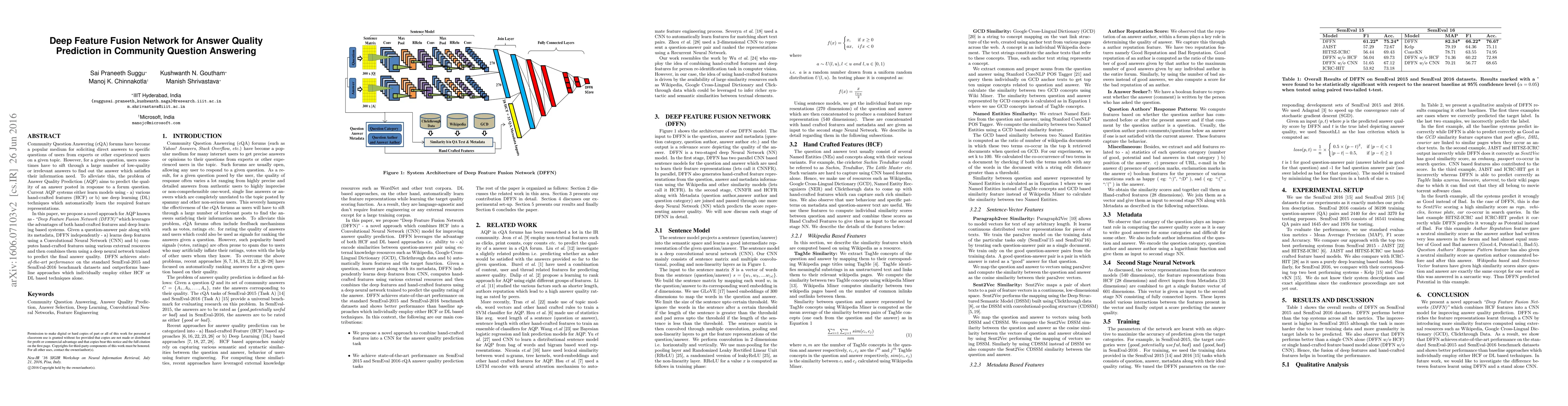 This research paper proposes a Deep Feature Fusion Network (DFFN) for predicting answer quality in community question answering forums, achieving state-of-the-art performance on benchmark datasets.