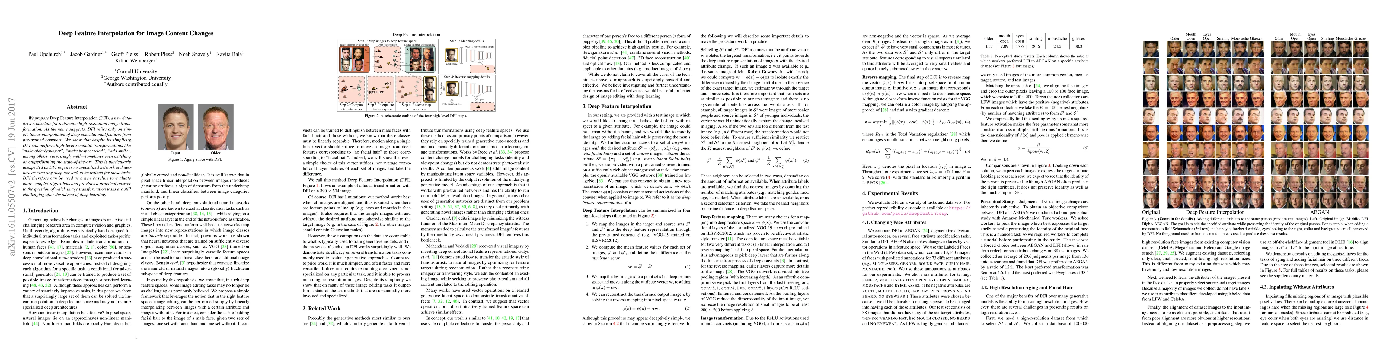 Deep Feature Interpolation (DFI) achieves surprising performance on high-level semantic transformations using only simple linear interpolation of deep convolutional features from pre-trained convnets.