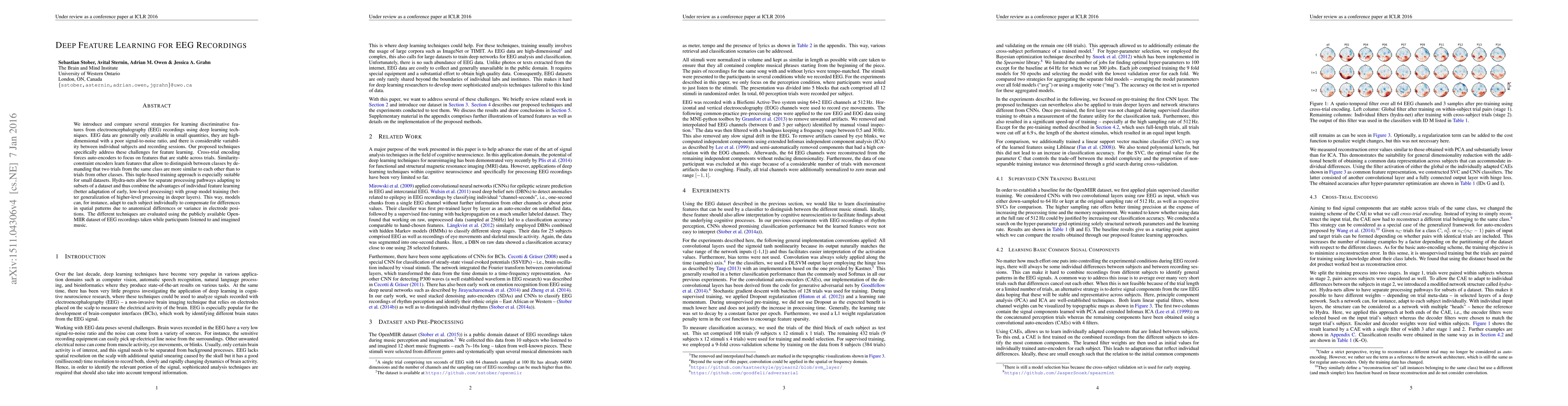 This research paper introduces new deep learning techniques for extracting meaningful features from EEG recordings, which are challenging due to small datasets and variability between subjects. The proposed methods improve feature learning for brain-computer interfaces and other applications.