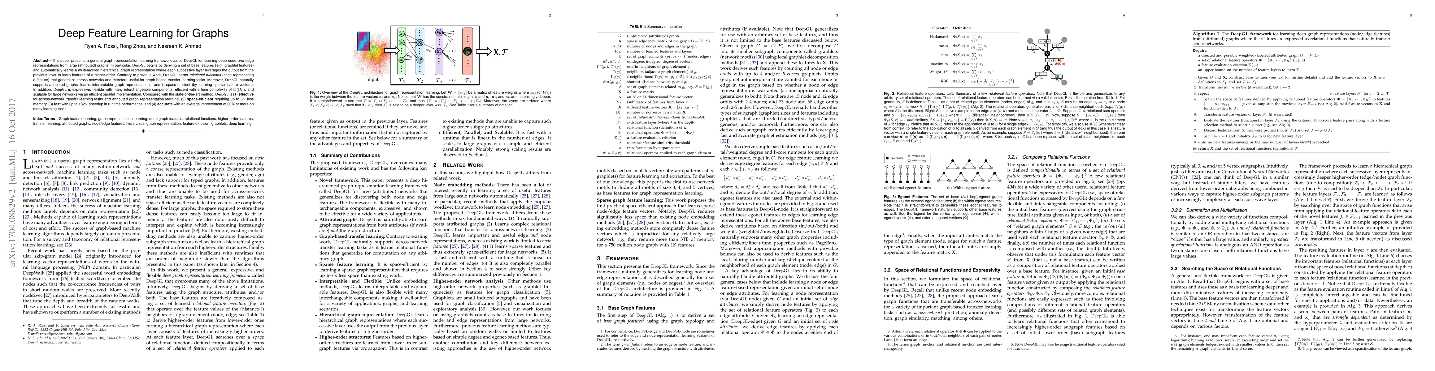 This paper introduces DeepGL, a framework for learning deep representations from large attributed graphs, which efficiently learns multi-layered hierarchical features and generalizes across networks for transfer learning, demonstrating significant improvements in memory usage, runtime speed, and accuracy.