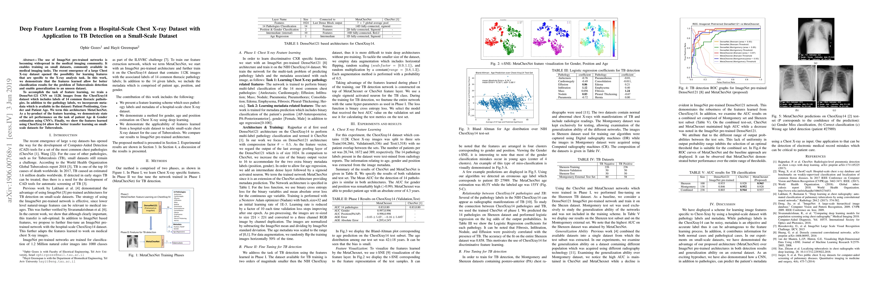 The use of ImageNet pre-trained networks is becoming widespread in the medical imaging community. It enables training on small datasets, commonly available in medical imaging tasks. The recent emergence of a large Chest X-ray dataset opened the possibility for learning features that are specific to the X-ray analysis task. In this work, we demonstrate that the features learned allow for better classification results for the problem of Tuberculosis detection and enable generalization to an unseen dataset. To accomplish the task of feature learning, we train a DenseNet-121 CNN on 112K images from the ChestXray14 dataset which includes labels of 14 common thoracic pathologies. In addition to the pathology labels, we incorporate metadata which is available in the dataset: Patient Positioning, Gender and Patient Age. We term this architecture MetaChexNet. As a by-product of the feature learning, we demonstrate state of the art performance on the task of patient Age \& Gender estimation using CNN's. Finally, we show the features learned using ChestXray14 allow for better transfer learning on small-scale datasets for Tuberculosis.
