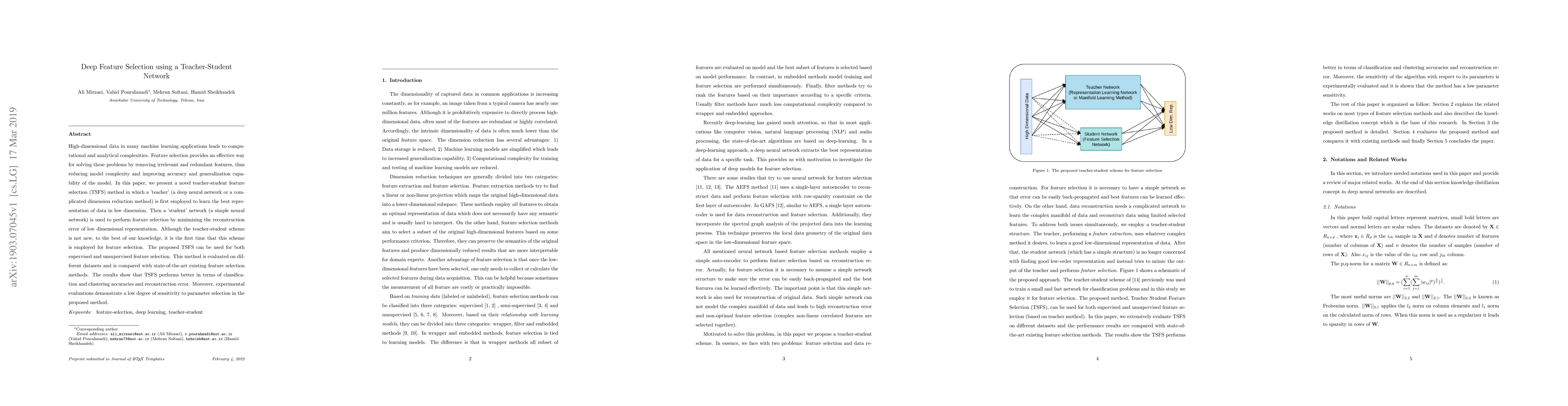 This paper introduces a novel teacher-student network method for deep feature selection, where a 'teacher' network reduces data dimensionality and a 'student' network performs feature selection based on reconstruction error. The proposed method outperforms existing techniques in classification and clustering accuracy, demonstrating robustness to parameter selection.