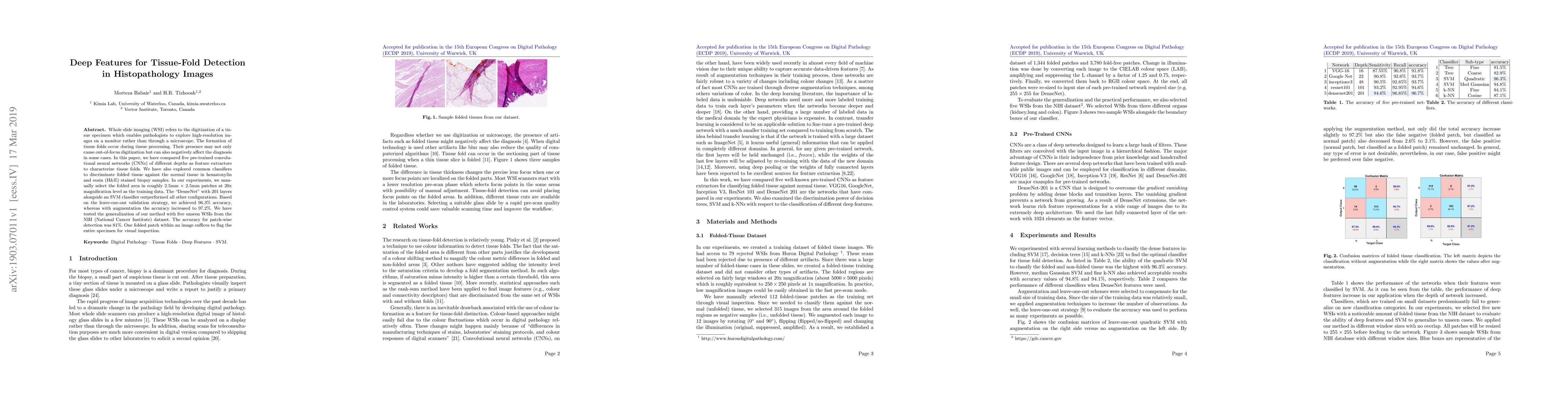 A deep learning approach using DenseNet and SVM was found to accurately detect tissue folds in histopathology images with 96.3% accuracy, outperforming other configurations.