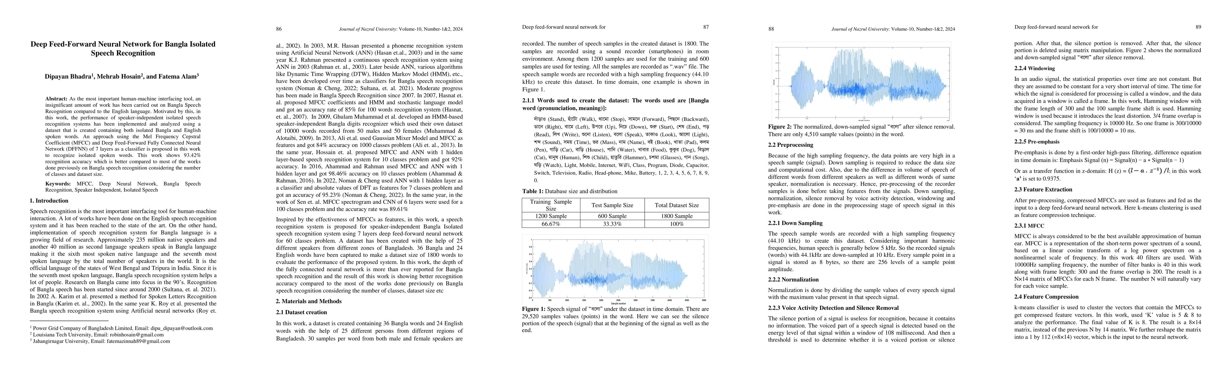 As the most important human-machine interfacing tool, an insignificant amount of work has been carried out on Bangla Speech Recognition compared to the English language. Motivated by this, in this work, the performance of speaker-independent isolated speech recognition systems has been implemented and analyzed using a dataset that is created containing both isolated Bangla and English spoken words. An approach using the Mel Frequency Cepstral Coefficient (MFCC) and Deep Feed-Forward Fully Connected Neural Network (DFFNN) of 7 layers as a classifier is proposed in this work to recognize isolated spoken words. This work shows 93.42% recognition accuracy which is better compared to most of the works done previously on Bangla speech recognition considering the number of classes and dataset size.