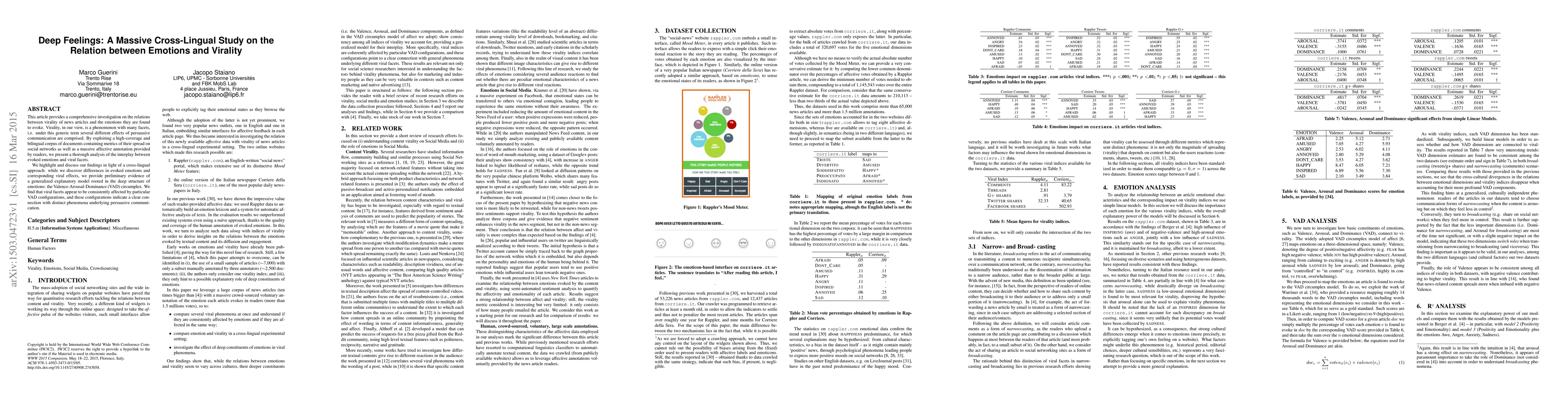 This article provides a comprehensive investigation on the relations between virality of news articles and the emotions they are found to evoke. Virality, in our view, is a phenomenon with many facets, i.e. under this generic term several different effects of persuasive communication are comprised. By exploiting a high-coverage and bilingual corpus of documents containing metrics of their spread on social networks as well as a massive affective annotation provided by readers, we present a thorough analysis of the interplay between evoked emotions and viral facets. We highlight and discuss our findings in light of a cross-lingual approach: while we discover differences in evoked emotions and corresponding viral effects, we provide preliminary evidence of a generalized explanatory model rooted in the deep structure of emotions: the Valence-Arousal-Dominance (VAD) circumplex. We find that viral facets appear to be consistently affected by particular VAD configurations, and these configurations indicate a clear connection with distinct phenomena underlying persuasive communication.