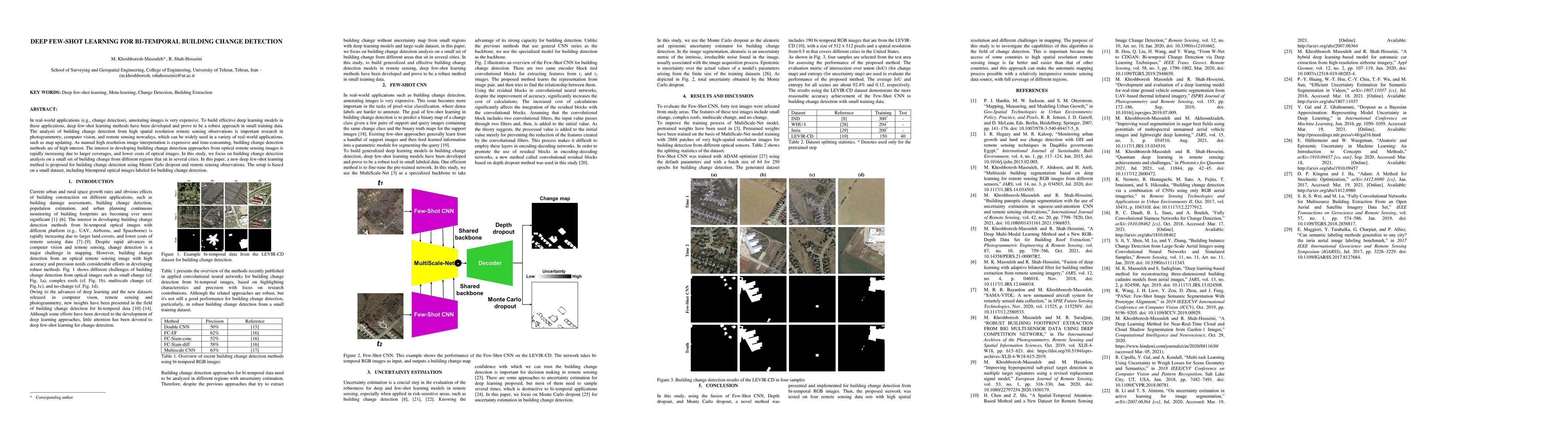 In real-world applications (e.g., change detection), annotating images is very expensive. To build effective deep learning models in these applications, deep few-shot learning methods have been developed and prove to be a robust approach in small training data. The analysis of building change detection from high spatial resolution remote sensing observations is important research in photogrammetry, computer vision, and remote sensing nowadays, which can be widely used in a variety of real-world applications, such as map updating. As manual high resolution image interpretation is expensive and time-consuming, building change detection methods are of high interest. The interest in developing building change detection approaches from optical remote sensing images is rapidly increasing due to larger coverages, and lower costs of optical images. In this study, we focus on building change detection analysis on a small set of building change from different regions that sit in several cities. In this paper, a new deep few-shot learning method is proposed for building change detection using Monte Carlo dropout and remote sensing observations. The setup is based on a small dataset, including bitemporal optical images labeled for building change detection.
