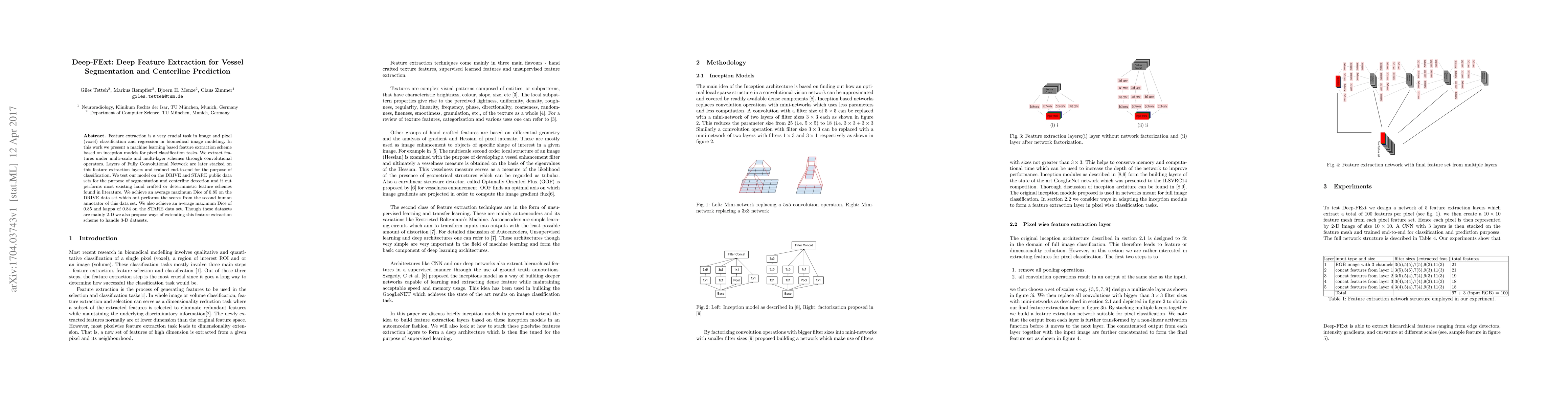 Feature extraction is a very crucial task in image and pixel (voxel) classification and regression in biomedical image modeling. In this work we present a machine learning based feature extraction scheme based on inception models for pixel classification tasks. We extract features under multi-scale and multi-layer schemes through convolutional operators. Layers of Fully Convolutional Network are later stacked on this feature extraction layers and trained end-to-end for the purpose of classification. We test our model on the DRIVE and STARE public data sets for the purpose of segmentation and centerline detection and it out performs most existing hand crafted or deterministic feature schemes found in literature. We achieve an average maximum Dice of 0.85 on the DRIVE data set which out performs the scores from the second human annotator of this data set. We also achieve an average maximum Dice of 0.85 and kappa of 0.84 on the STARE data set. Though these datasets are mainly 2-D we also propose ways of extending this feature extraction scheme to handle 3-D datasets.