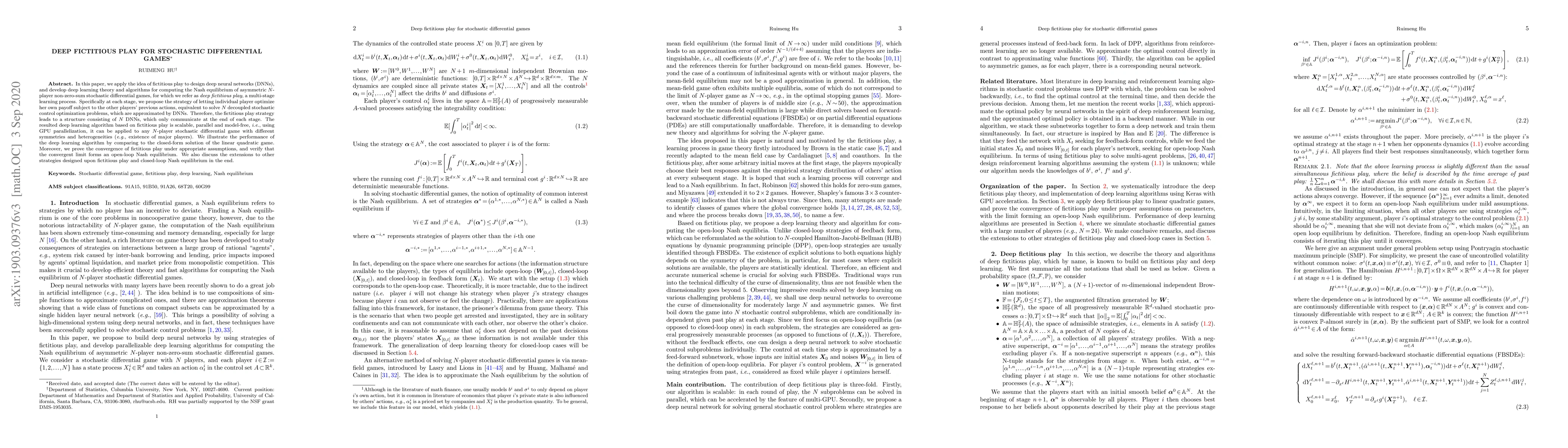 This paper introduces deep fictitious play, a novel deep learning approach for finding Nash equilibria in asymmetric $N$-player stochastic differential games. It leverages DNNs to solve decoupled stochastic control problems iteratively, demonstrating scalability, parallelizability, and model-free applicability, while proving convergence to an open-loop Nash equilibrium.
