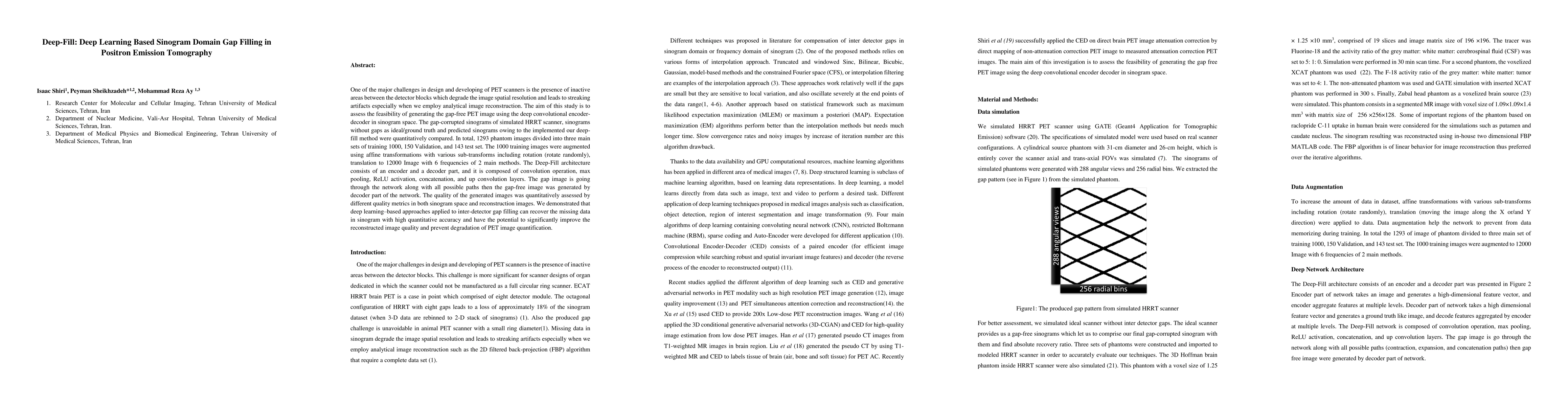 One of the major challenges in design and developing of PET, scanners are the presence of inactive areas between the detector blocks which degrade the image spatial resolution and leads to streaking artifacts especially when we employ analytical image reconstruction. The aim of this study is to assess the feasibility of generating the gap-free PET image using the deep convolutional encoder-decoder in sinogram space. The gap-corrupted sinograms of simulated HRRT scanner, sinograms without gaps as ideal/ground truth and predicted sinograms owing to the implemented our deep-fill method were quantitatively compared. In total, 1293 phantom images divided into three main sets of training 1000, 150 Validation, and 143 test set. The 1000 training images were augmented using affine transformations with various sub-transforms including rotation (rotate randomly), translation to 12000 Image with 6 frequencies of 2 main methods. The Deep-Fill architecture consists of an encoder and a decoder part, and it is composed of convolution operation, max pooling, ReLU activation, concatenation, and up convolution layers. The gap image is going through the network along with all possible paths then the gap-free image was generated by decoder part of the network. The quality of the generated images was quantitatively assessed by different quality metrics in both sinogram space and reconstruction images. We demonstrated that deep learning based approaches applied to inter-detector gap filling can recover the missing data in sinogram with high quantitative accuracy and have the potential to significantly improve the reconstructed image quality and prevent degradation of PET image quantification.