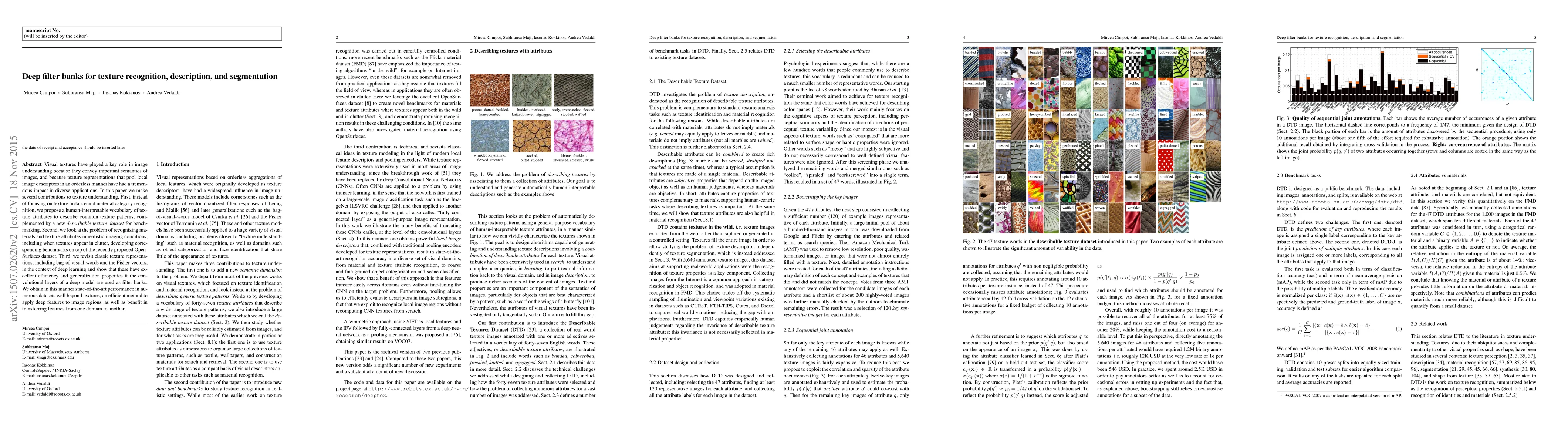Visual textures have played a key role in image understanding because they convey important semantics of images, and because texture representations that pool local image descriptors in an orderless manner have had a tremendous impact in diverse applications. In this paper we make several contributions to texture understanding. First, instead of focusing on texture instance and material category recognition, we propose a human-interpretable vocabulary of texture attributes to describe common texture patterns, complemented by a new describable texture dataset for benchmarking. Second, we look at the problem of recognizing materials and texture attributes in realistic imaging conditions, including when textures appear in clutter, developing corresponding benchmarks on top of the recently proposed OpenSurfaces dataset. Third, we revisit classic texture representations, including bag-of-visual-words and the Fisher vectors, in the context of deep learning and show that these have excellent efficiency and generalization properties if the convolutional layers of a deep model are used as filter banks. We obtain in this manner state-of-the-art performance in numerous datasets well beyond textures, an efficient method to apply deep features to image regions, as well as benefit in transferring features from one domain to another.
