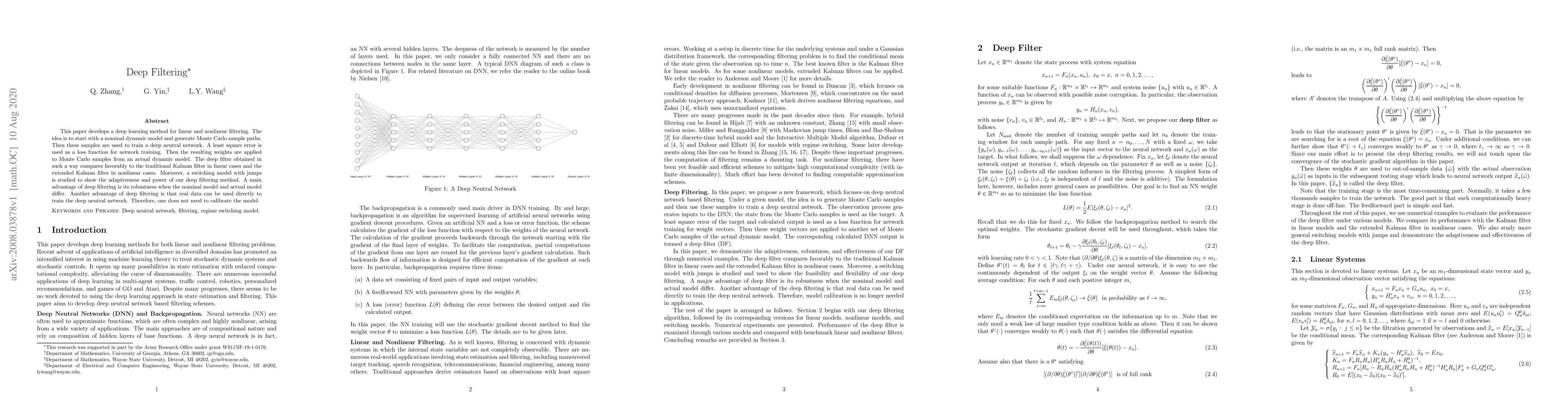 This paper develops a deep learning method for linear and nonlinear filtering. The idea is to start with a nominal dynamic model and generate Monte Carlo sample paths. Then these samples are used to train a deep neutral network. A least square error is used as a loss function for network training. Then the resulting weights are applied to Monte Carlo sampl\ es from an actual dynamic model. The deep filter obtained in such a way compares favorably to the traditional Kalman filter in linear cases and the extended Kalman filter in nonlinear cases. Moreover, a switching model with jumps is studied to show the adaptiveness and power of our deep filtering method. A main advantage of deep filtering is its robustness when the nominal model and actual model differ. Another advantage of deep filtering is that real data can be used directly to train the deep neutral network. Therefore, one does not need to calibrate the model.