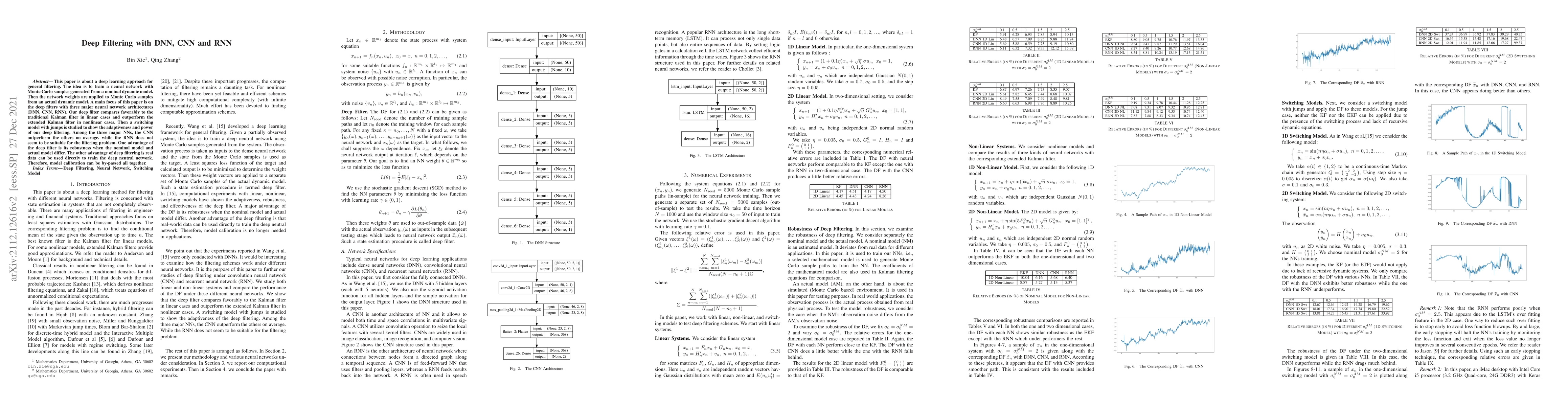 This research paper explores a deep learning approach for both linear and nonlinear filtering using DNN, CNN, and RNN architectures. The deep filter demonstrates superior performance compared to traditional Kalman filters, especially in nonlinear scenarios, and showcases robustness when models differ. The CNN architecture generally outperforms the others, while the RNN is less suitable for this task. The method also allows for training directly on real data, eliminating the need for model calibration.