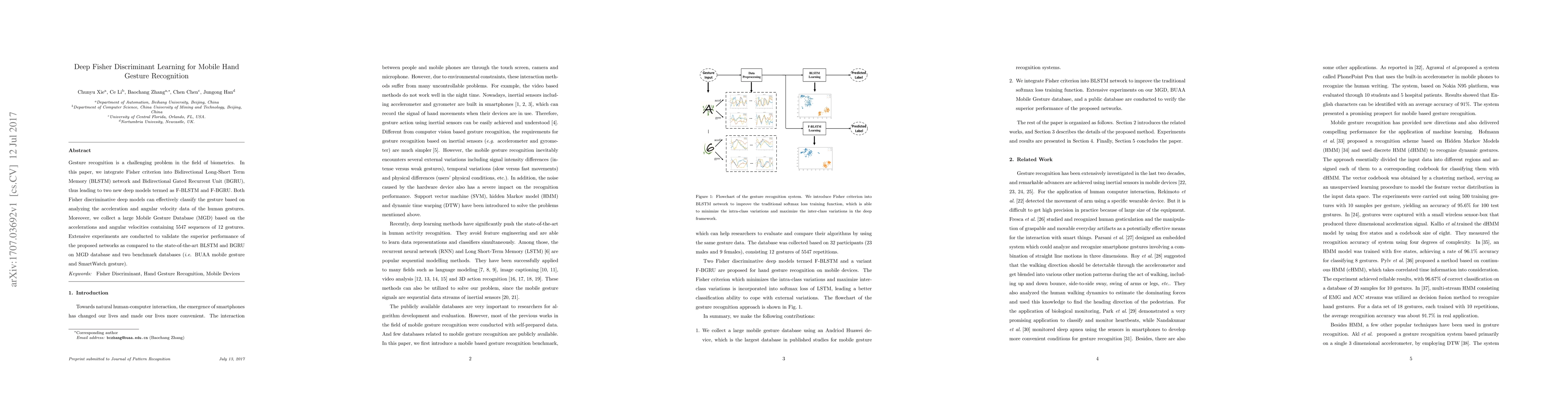 Gesture recognition is a challenging problem in the field of biometrics. In this paper, we integrate Fisher criterion into Bidirectional Long-Short Term Memory (BLSTM) network and Bidirectional Gated Recurrent Unit (BGRU),thus leading to two new deep models termed as F-BLSTM and F-BGRU. BothFisher discriminative deep models can effectively classify the gesture based on analyzing the acceleration and angular velocity data of the human gestures. Moreover, we collect a large Mobile Gesture Database (MGD) based on the accelerations and angular velocities containing 5547 sequences of 12 gestures. Extensive experiments are conducted to validate the superior performance of the proposed networks as compared to the state-of-the-art BLSTM and BGRU on MGD database and two benchmark databases (i.e. BUAA mobile gesture and SmartWatch gesture).
