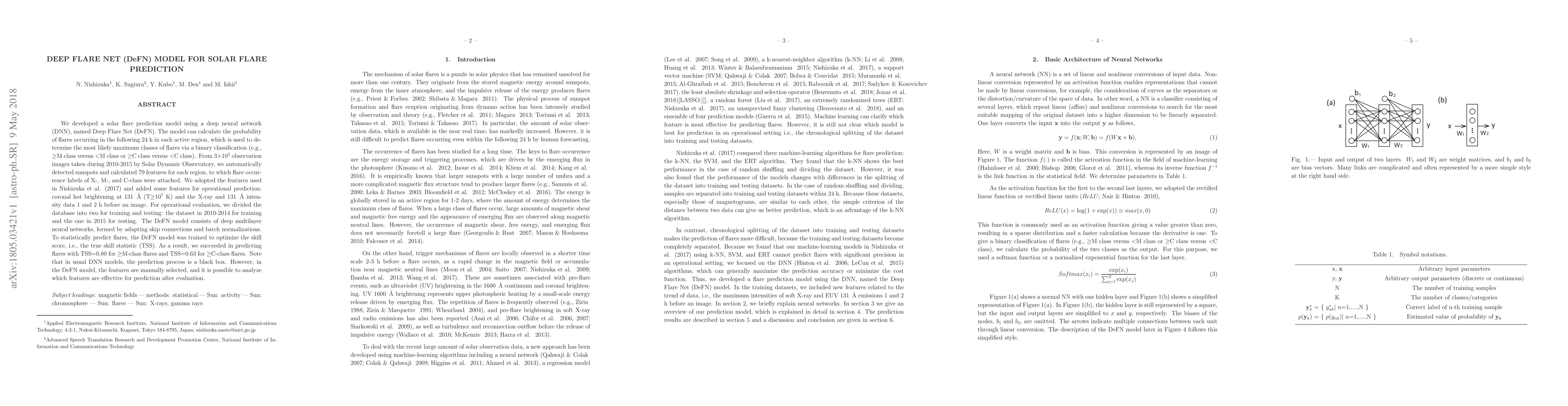 The Deep Flare Net (DeFN) model uses a deep neural network to predict solar flares, calculating the probability of flares occurring in the next 24 hours. It achieved a true skill statistic (TSS) of 0.80 for >=M-class flares and 0.63 for >=C-class flares, with manually selected features allowing for feature analysis.