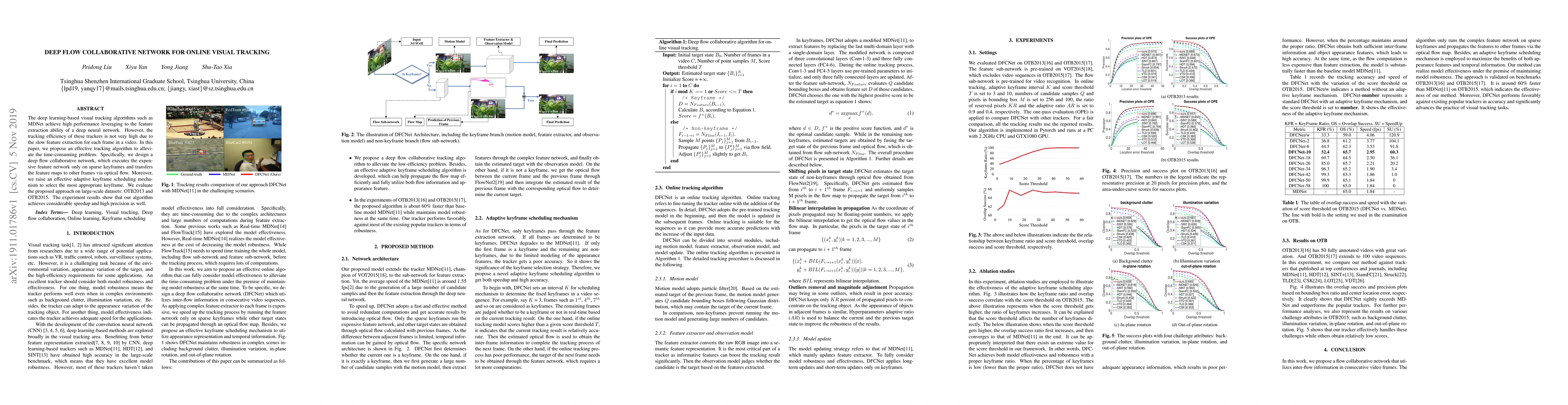 The paper proposes a deep flow collaborative network for online visual tracking that enhances efficiency by executing the feature extraction on sparse keyframes and transferring features to other frames via optical flow, achieving significant speedup and high precision on OTB2013 and OTB2015 datasets. An adaptive keyframe scheduling mechanism is also introduced to optimize keyframe selection.