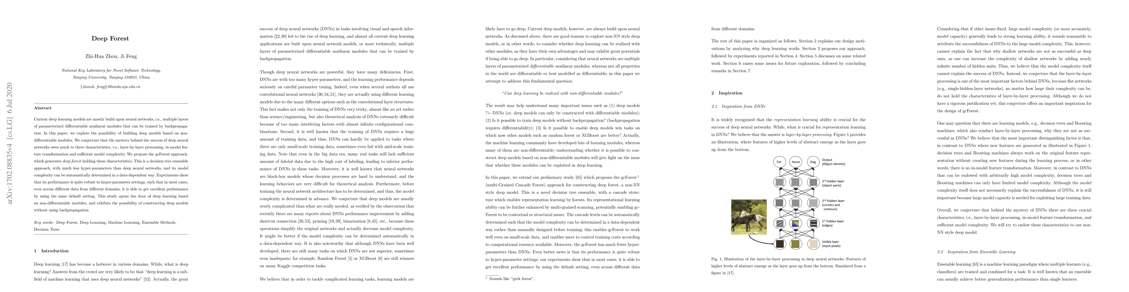 This paper proposes a new approach to deep learning called gcForest, which uses non-differentiable modules and achieves robust performance without the need for backpropagation, opening up possibilities for constructing deep models in a data-dependent way.